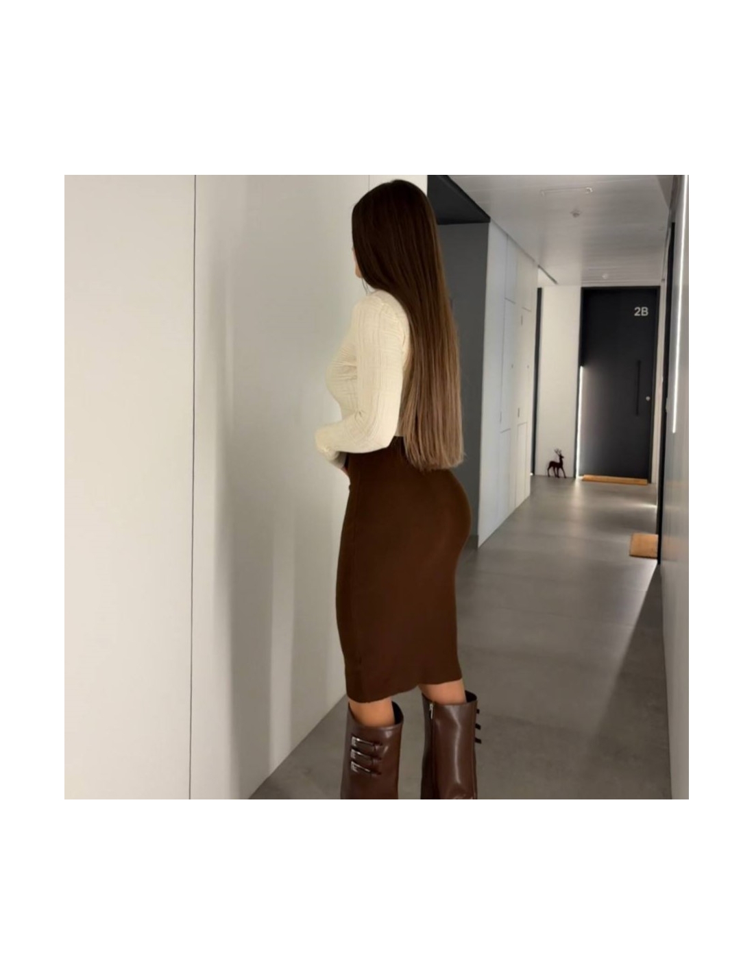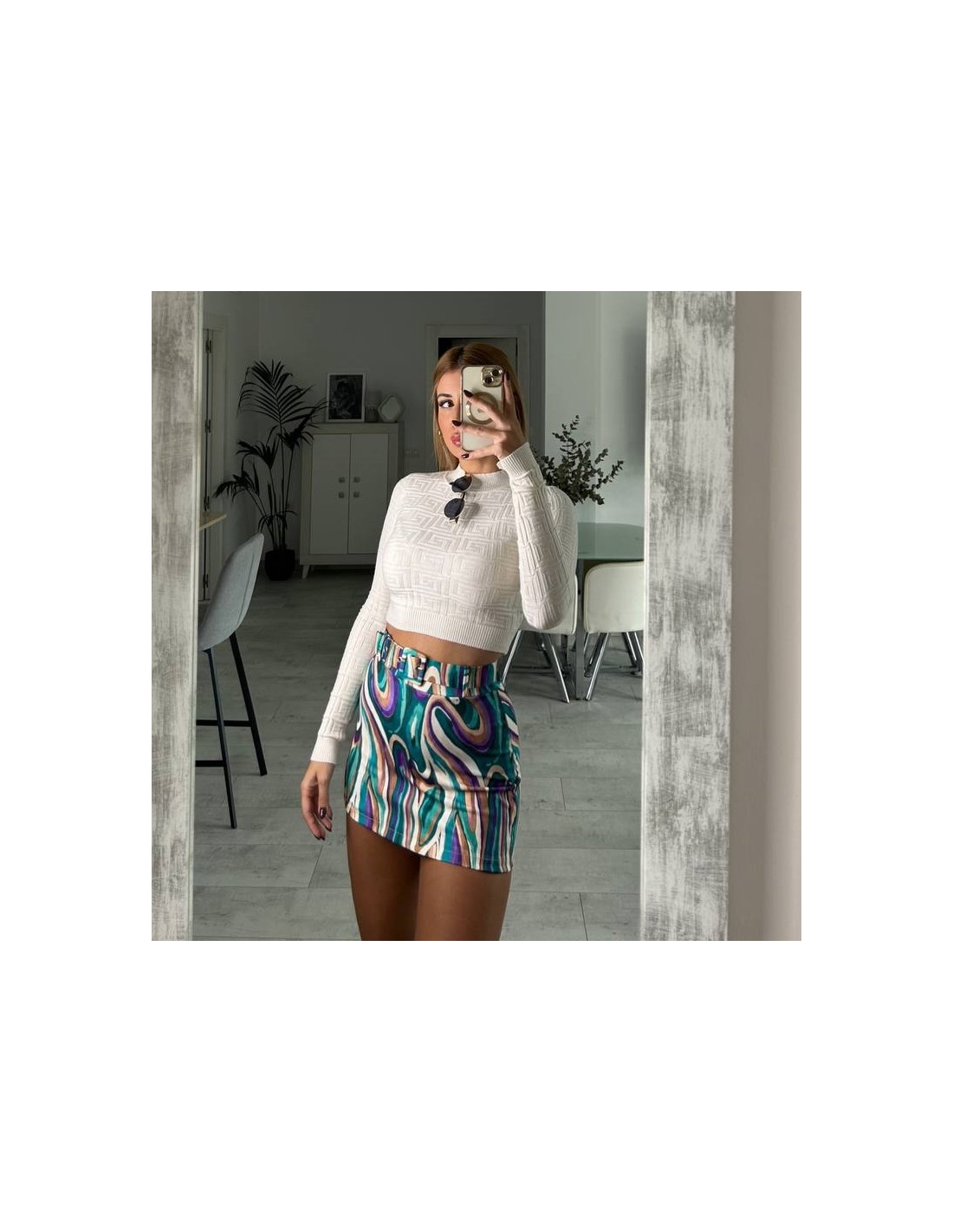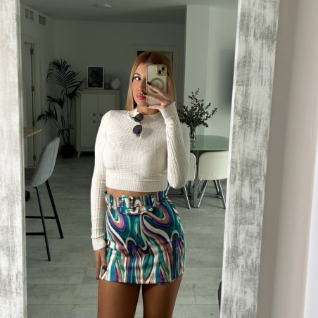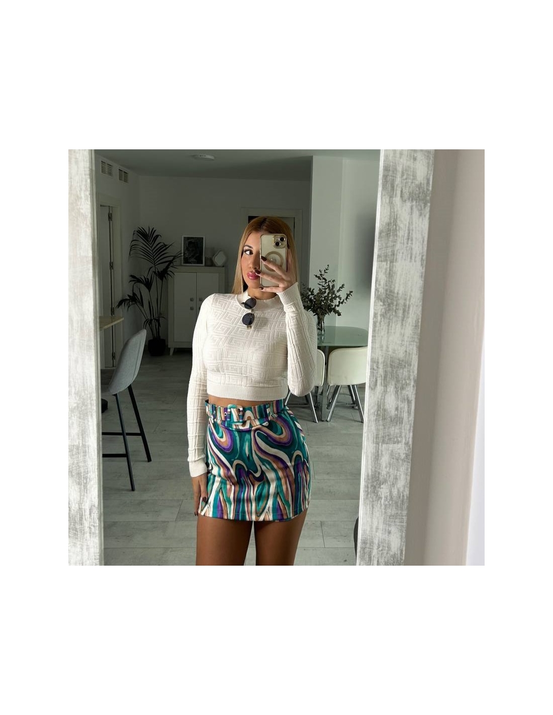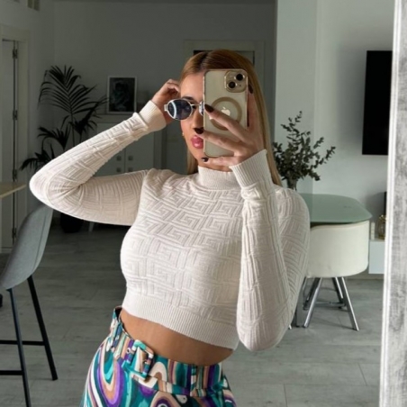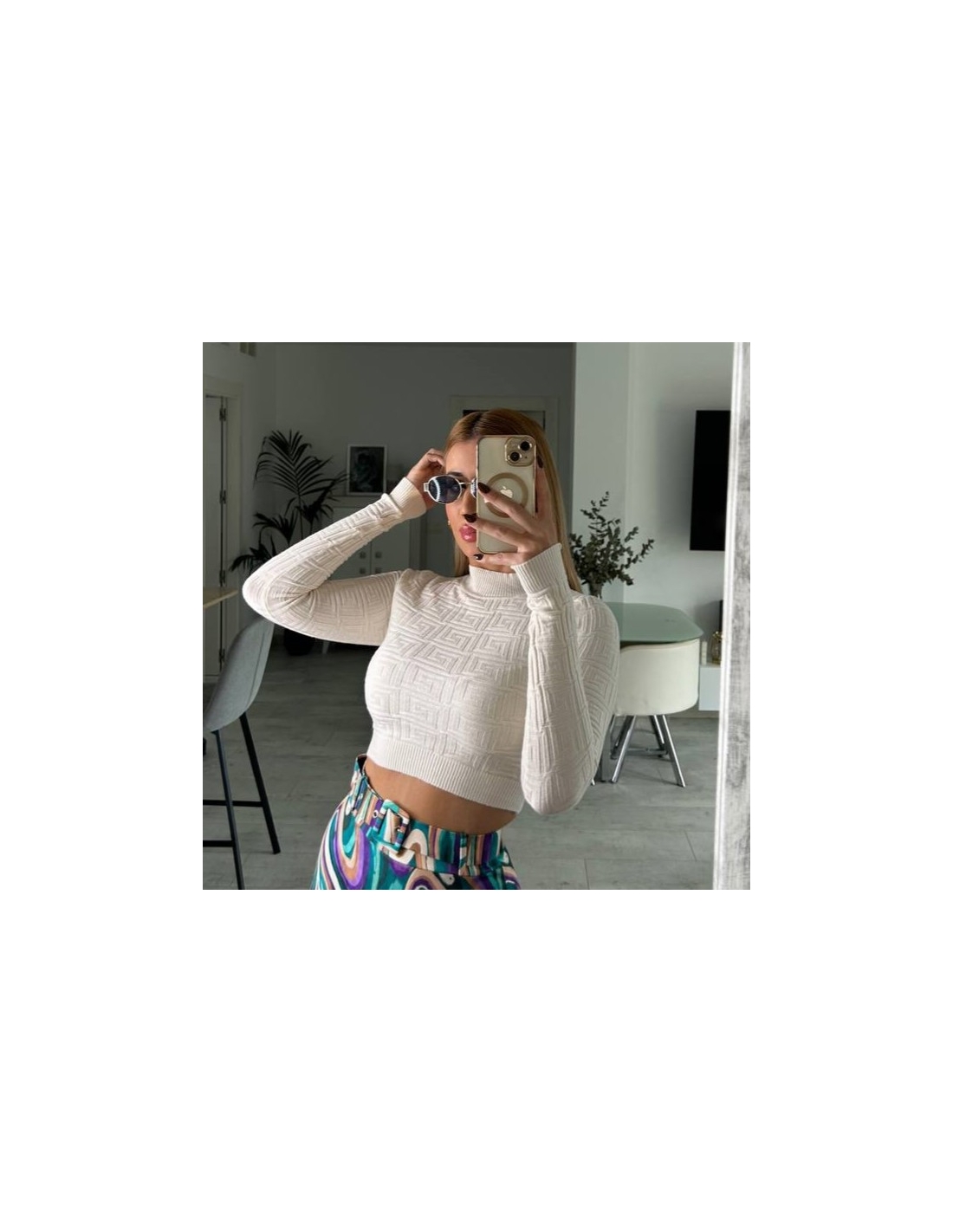 Jersey cortito geométrico en tono crema. De manga larga. Cuello redondo. Elástico. Talla única