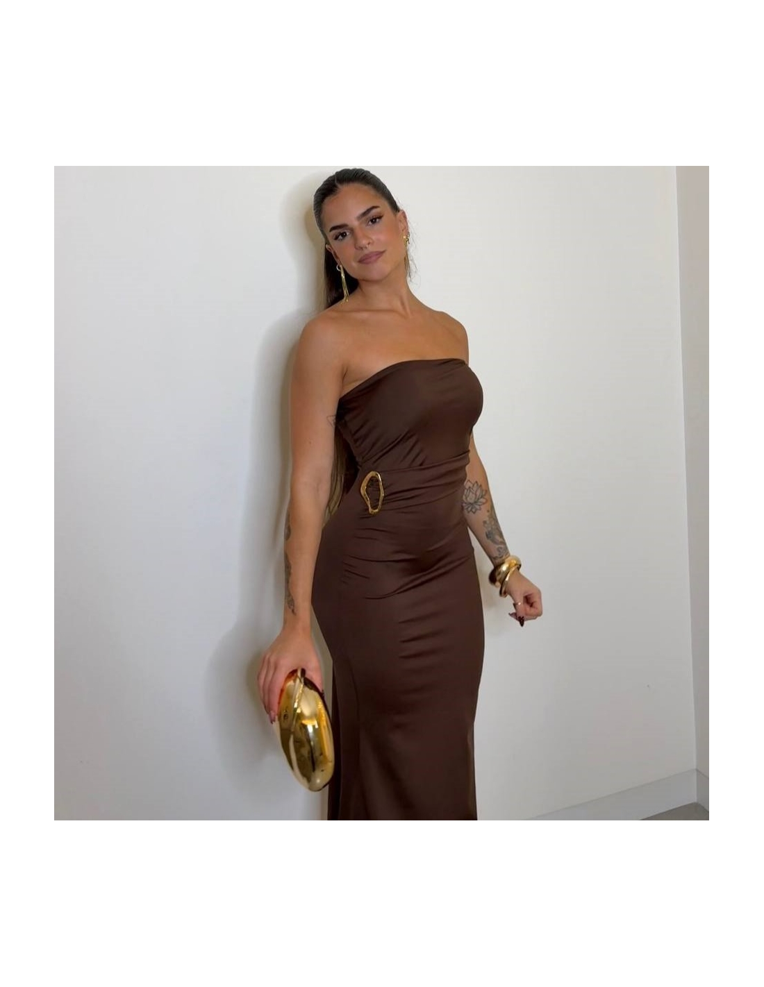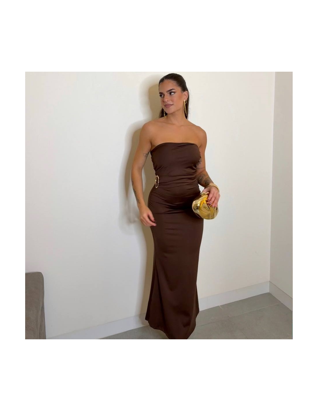Vestido palabra de honor de tejido doble licra en tono choco. Cascos incorporados. Detalle hebilla dorada en parte delantera. Talla única.