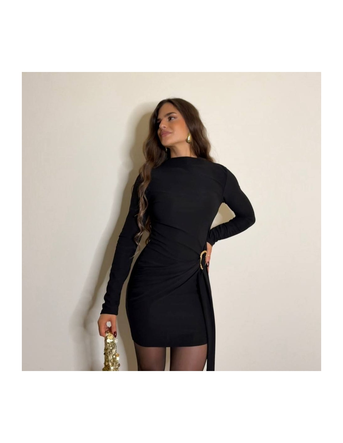 Vestido corto de manga larga en tono negro. Accesorio en lateral con lazada a tono. Elástico. Talla única