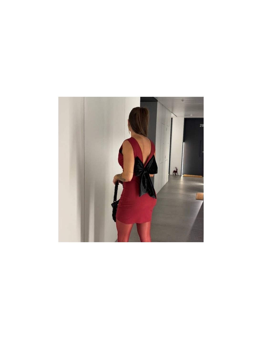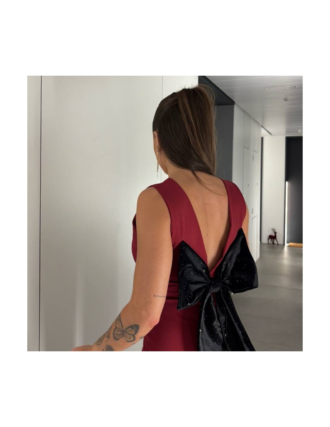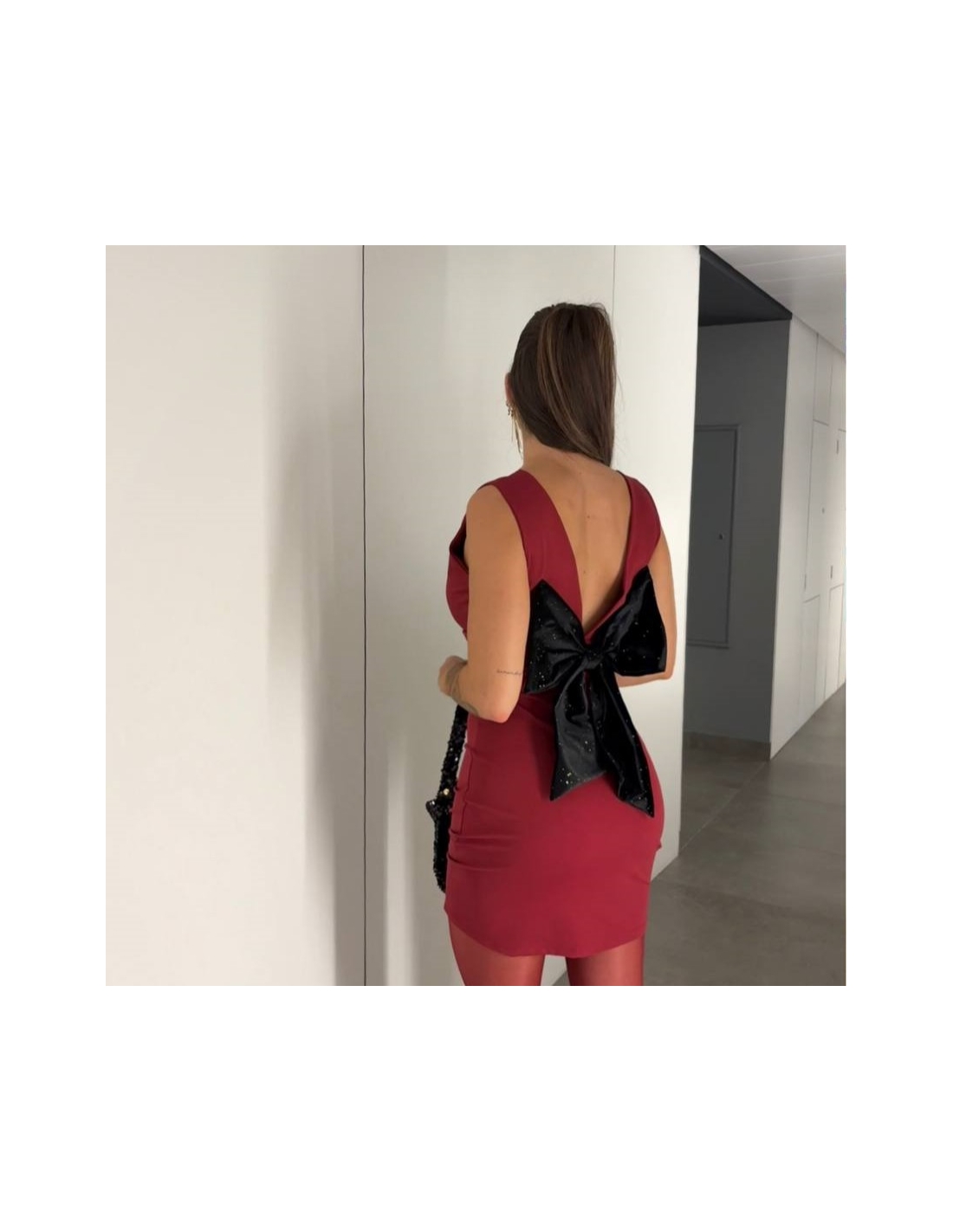 Vestido corto en tono vino con lazo coquette en parte trasera. Casco incorporado en la zona el pecho. Talla única