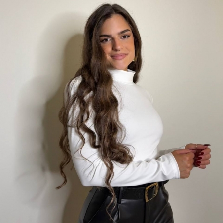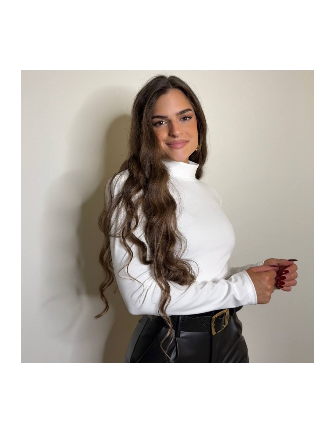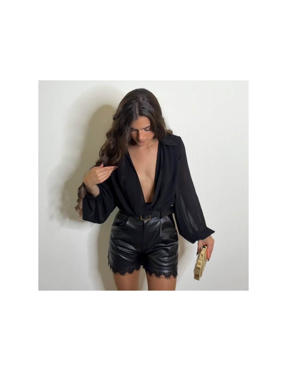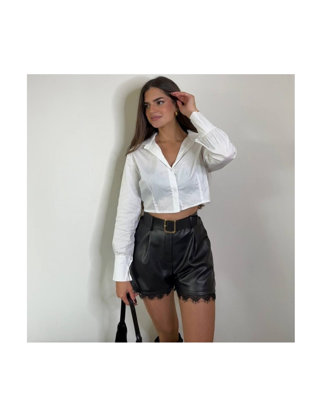 Pantalón de tiro alto en tono negro. Efecto piel. Encaje en bajo. cierre delantero con botón y cremallera. Talla única
