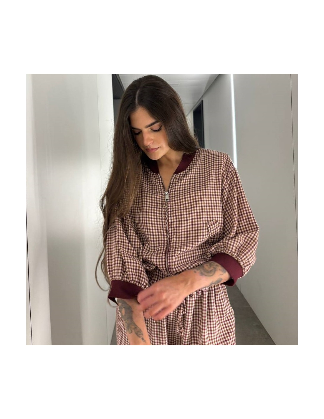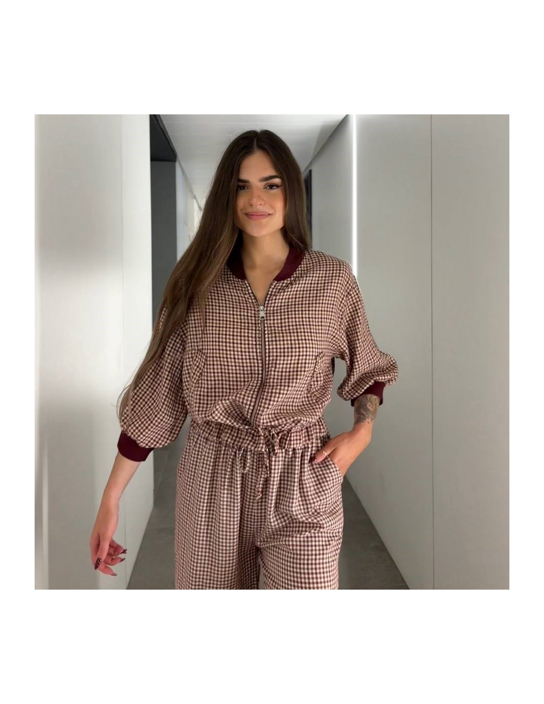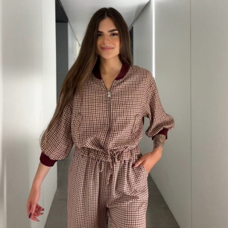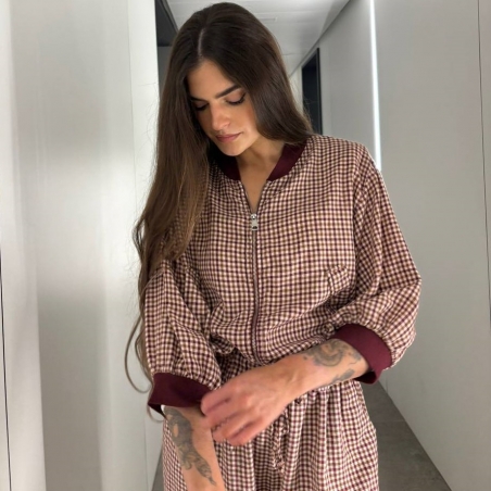 Conjunto chaqueta bomber a media manga con bajo elástico regulable + Pantalón fluído cintura elástica. Talla única.