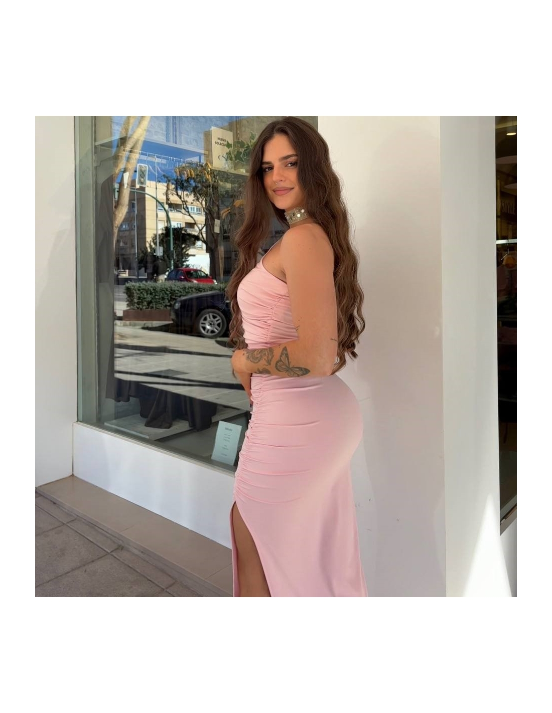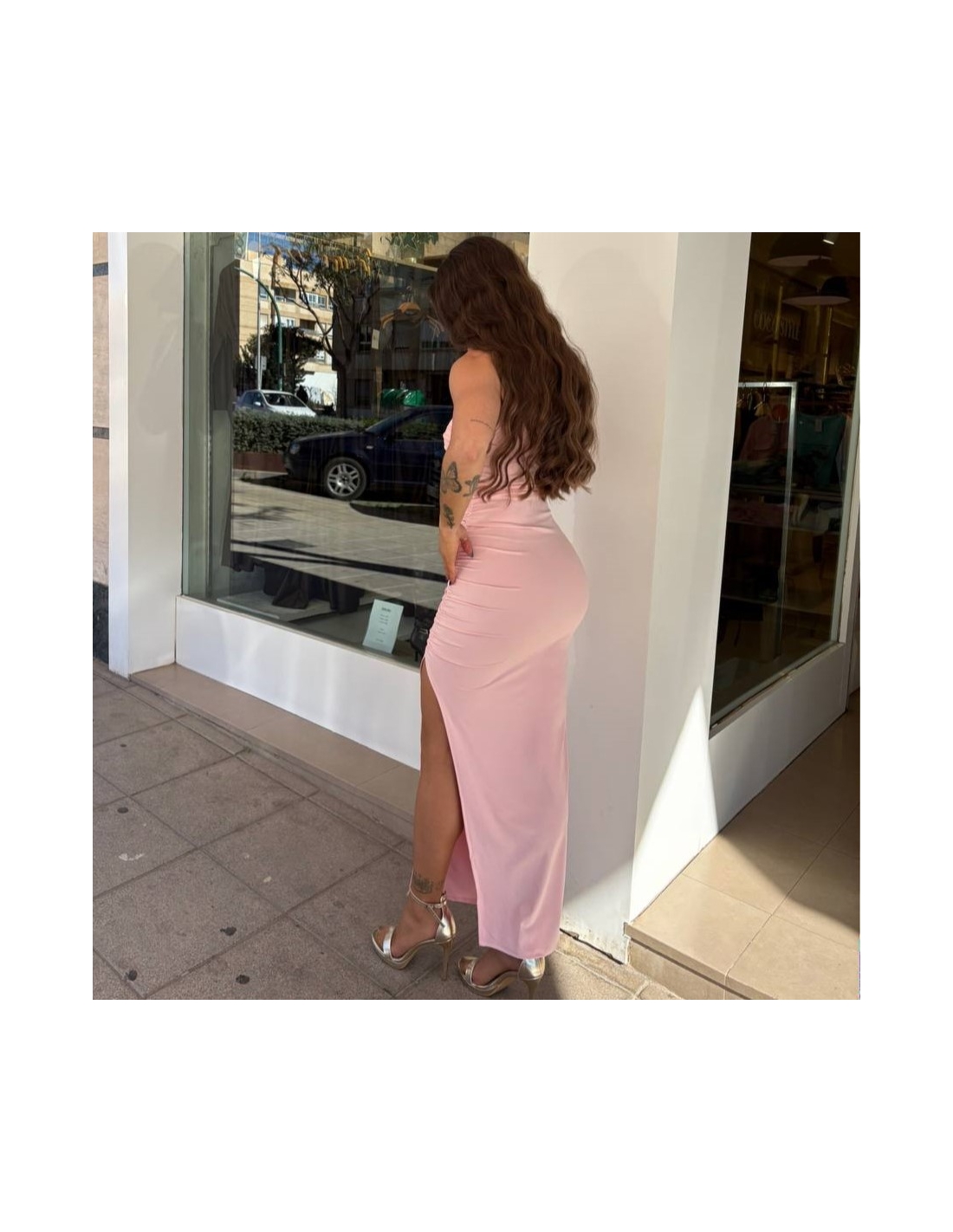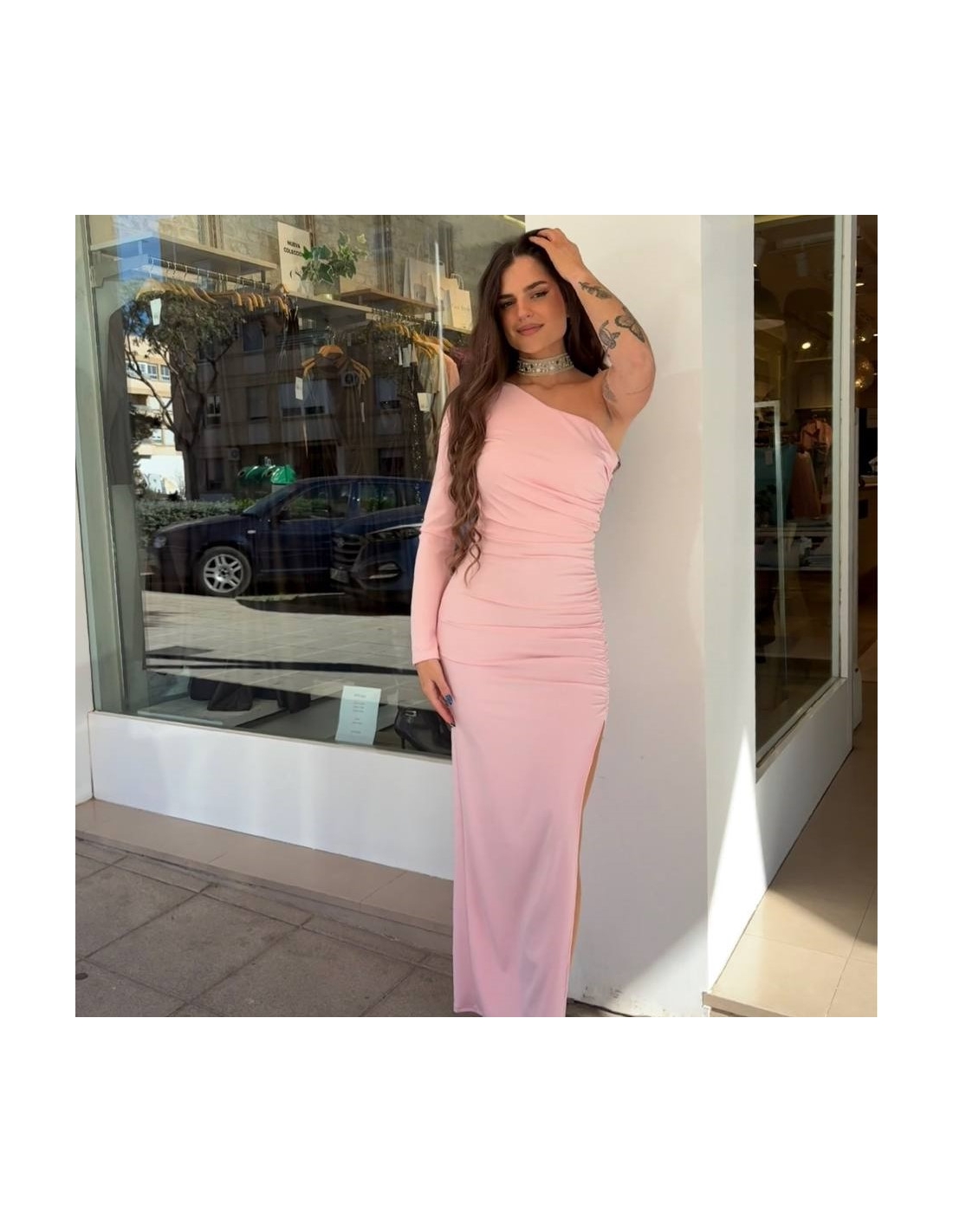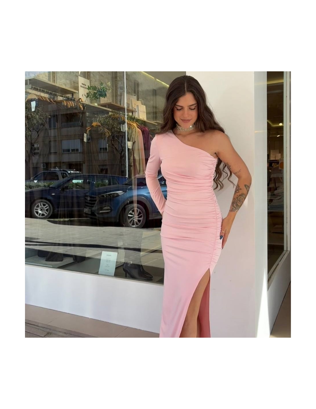 Vestido asimétrico rosita. Hombrera. Fruncido delantero. Abertura lateral. Talla única.