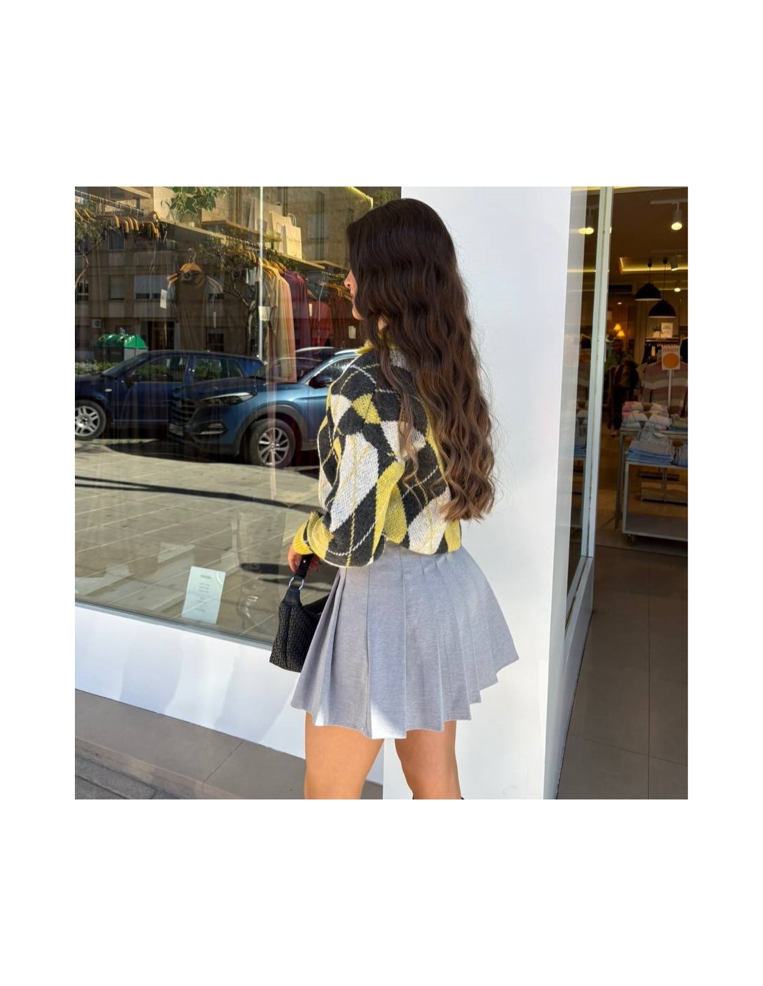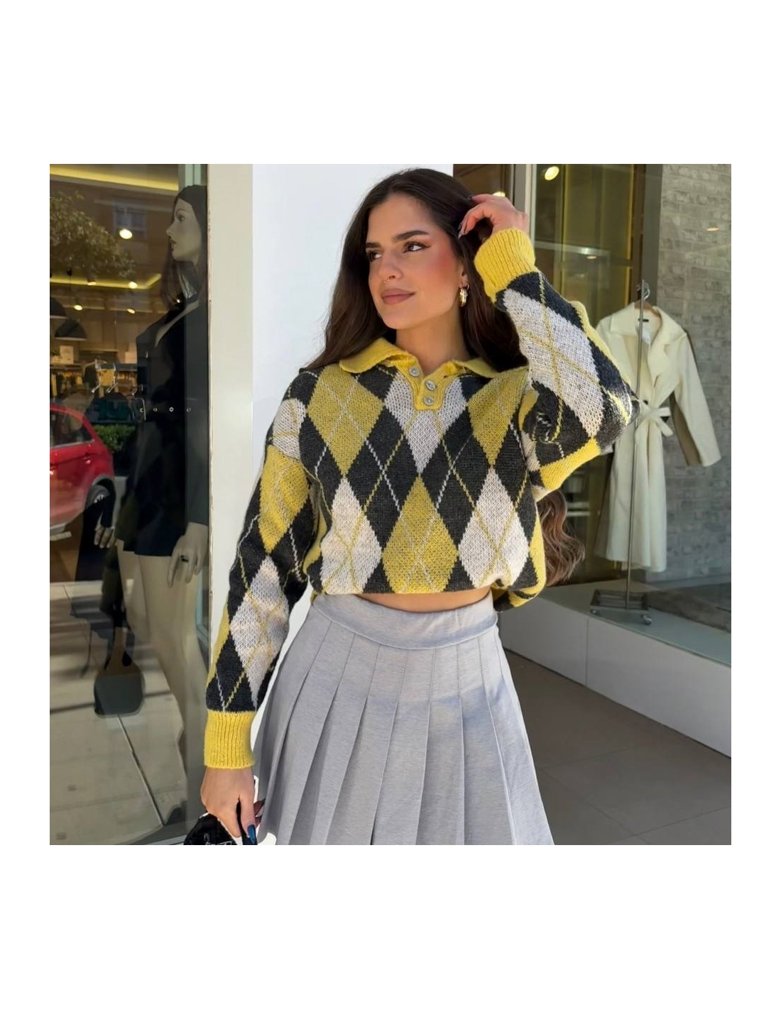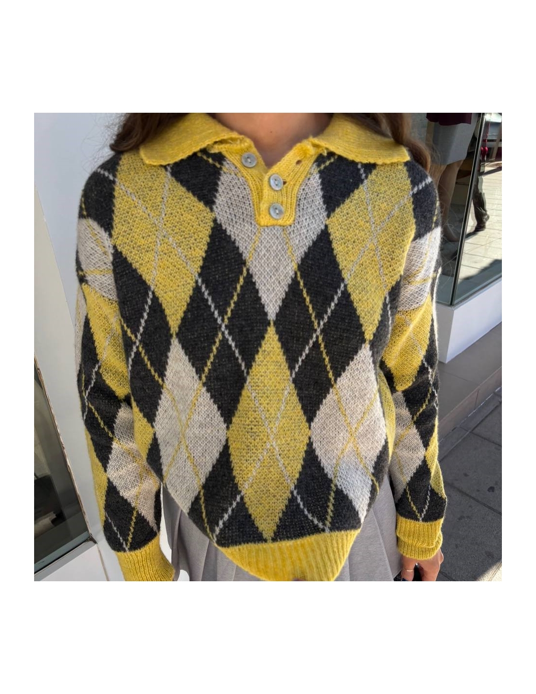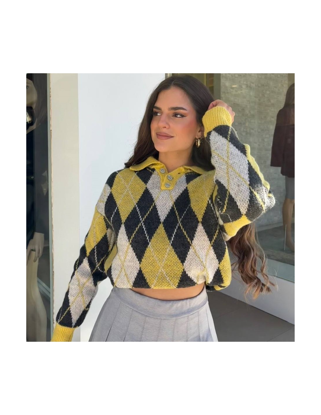 Jersey estampado rombos con cuello abotonado. Talla única.