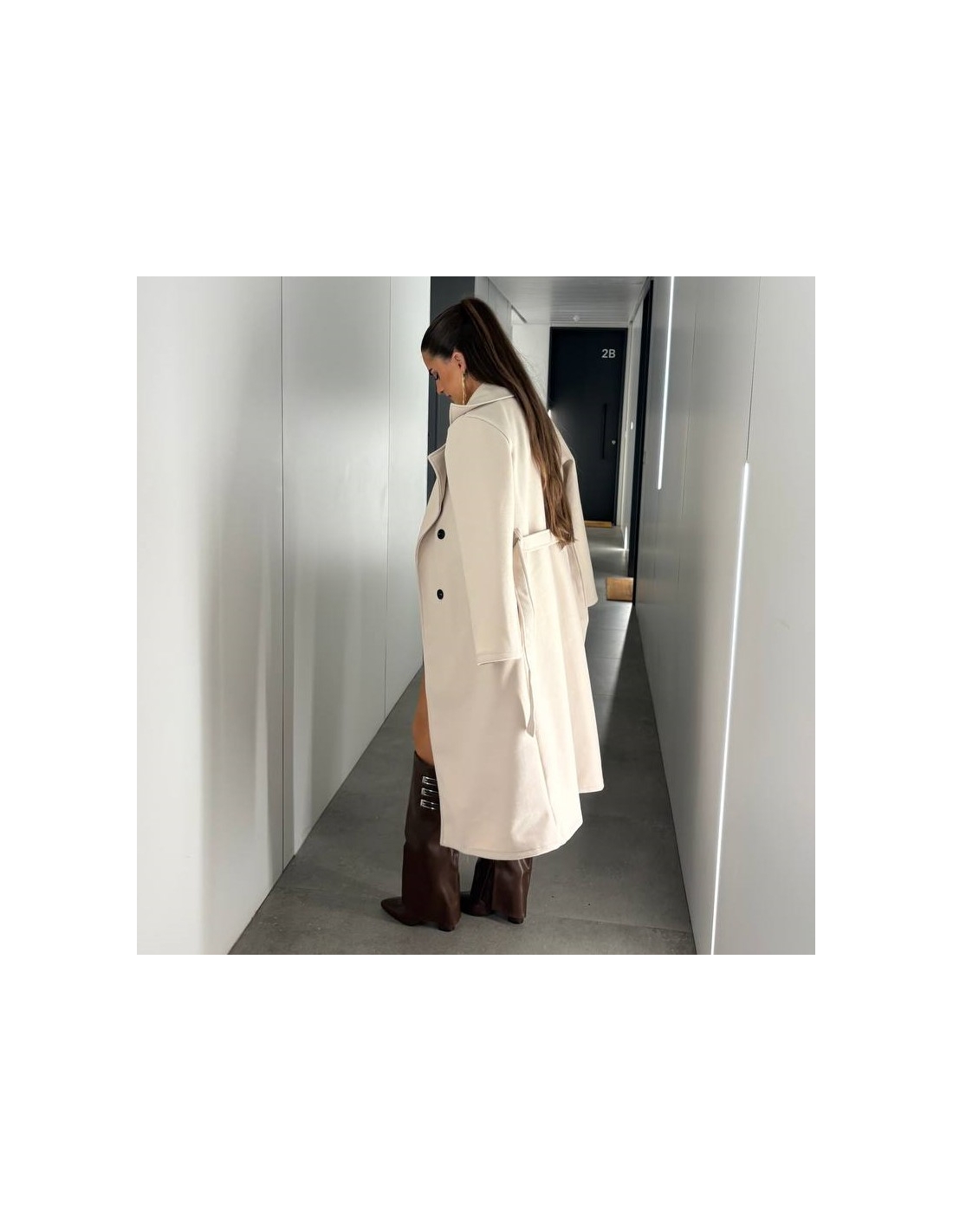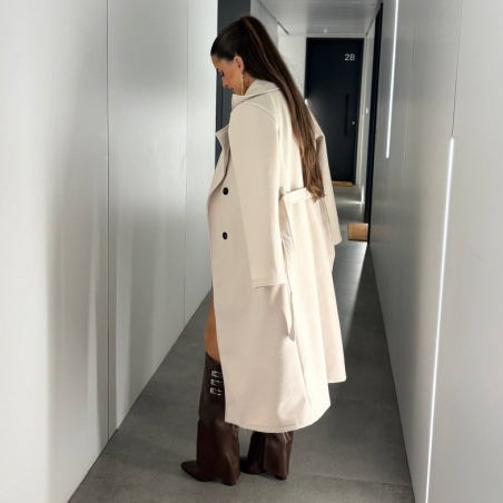 Abrigo paño largo. Con cinturón a tono. De manga larga. Cuello de solapa. Talla única