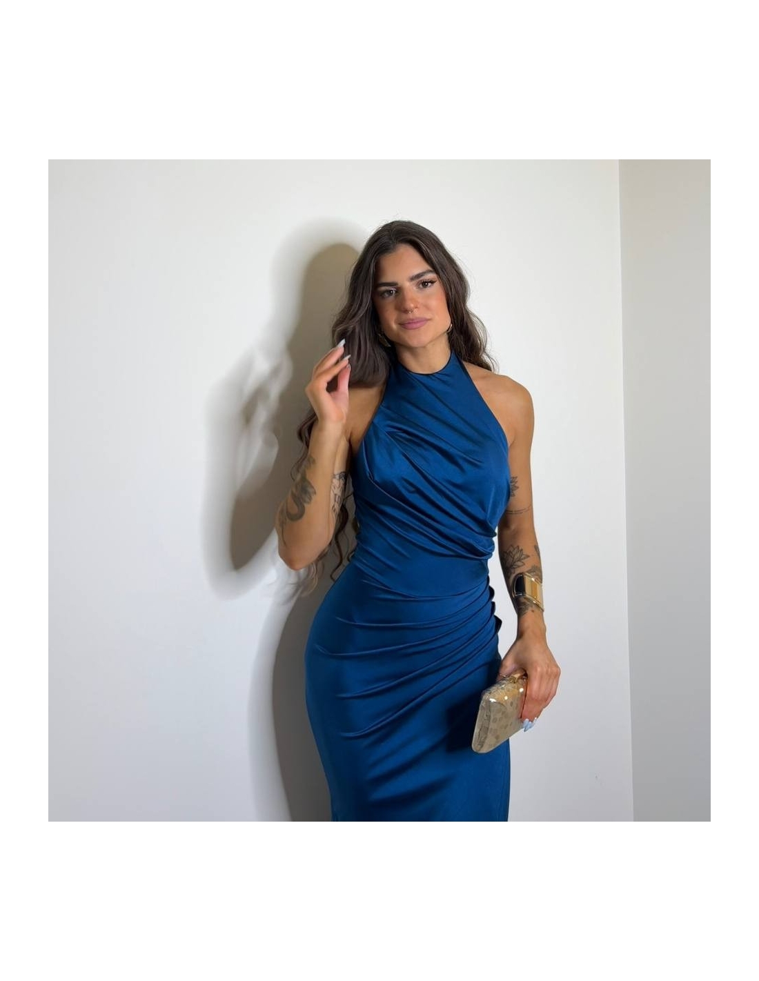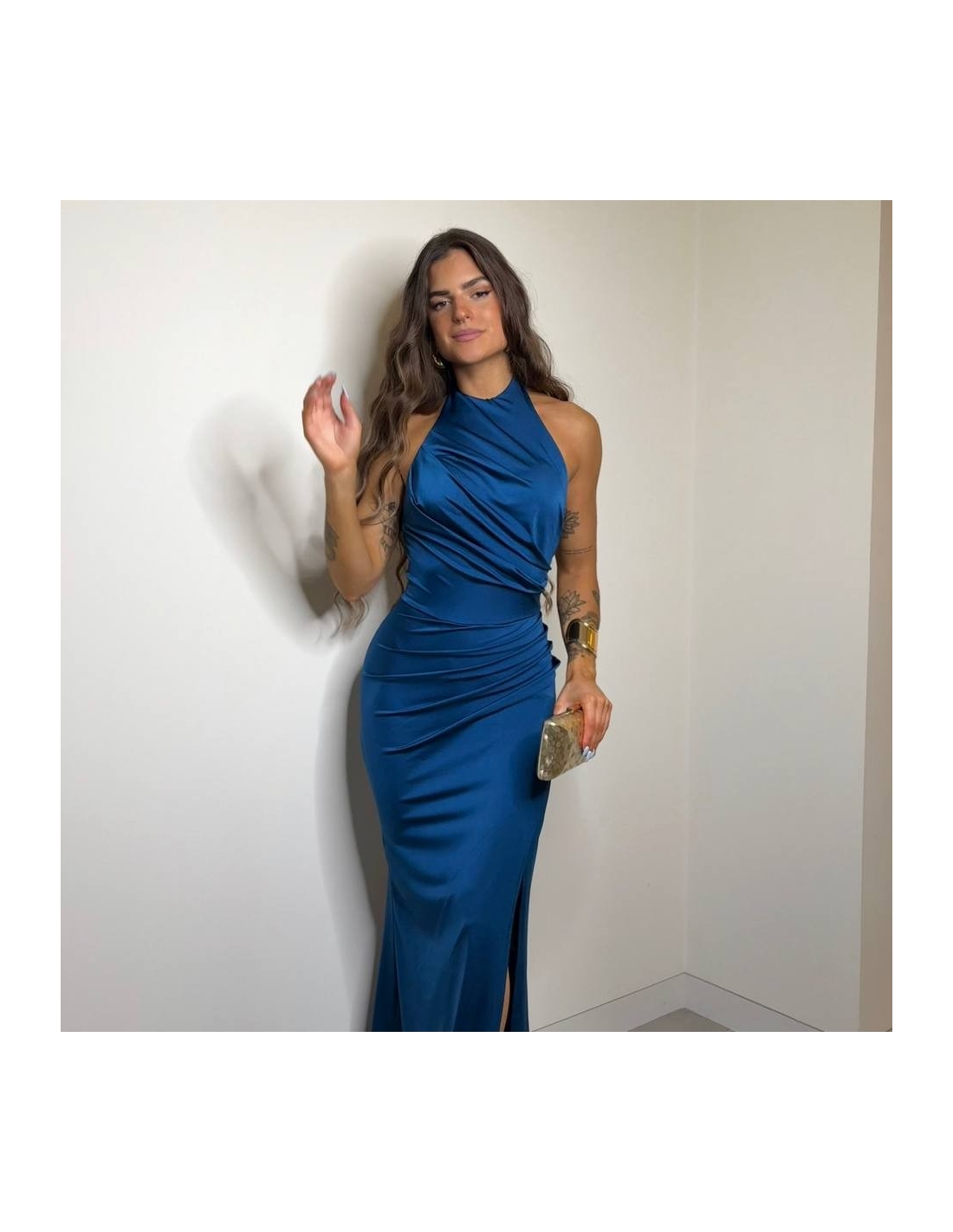 Vestido halter largo. Fruncido en parte delantera. Cierre trasero con cremallera oculta. Talla única