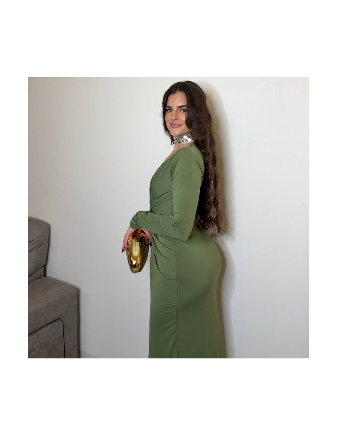 Vestido evento largo con hombreras y nudo delantero fruncido. De manga larga. Escote V. Talla única.