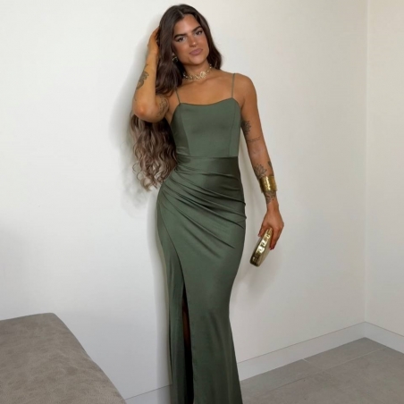 Vestido largo con espalda cruzada regulable y tiranta fina. Fruncido trasero inferior. Escote con varillas. Talla única.
