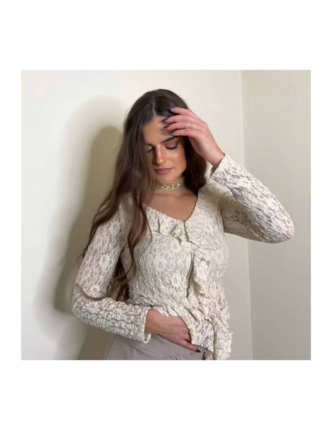 Blusa encaje crema de manga larga. Escote en V. Volantitos en parte delantera a tono. Talla única