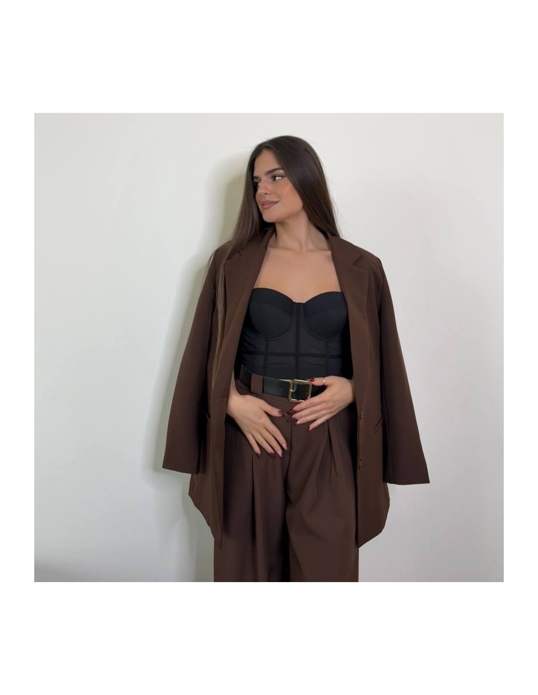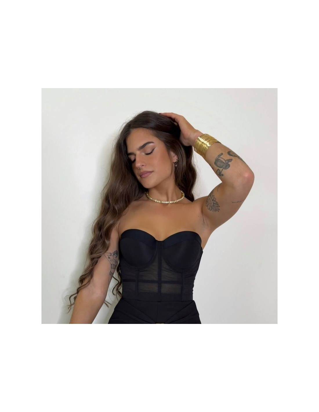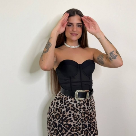 Corset negro en tono negro. Regulable con corchetes en parte trasera. Con casco incorporado.