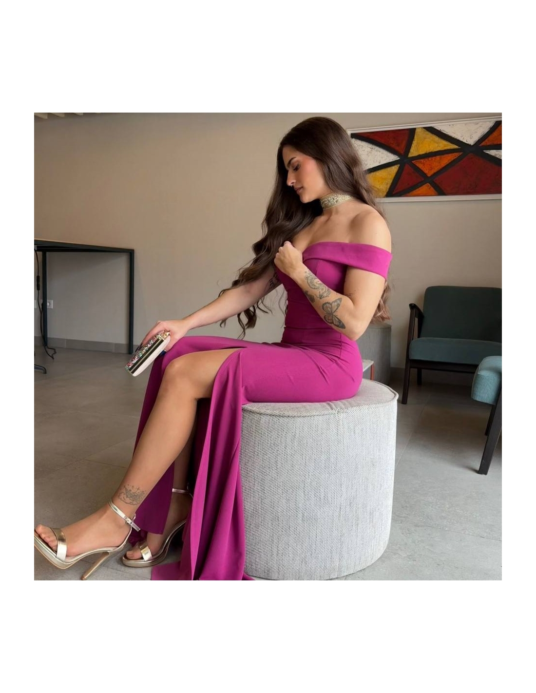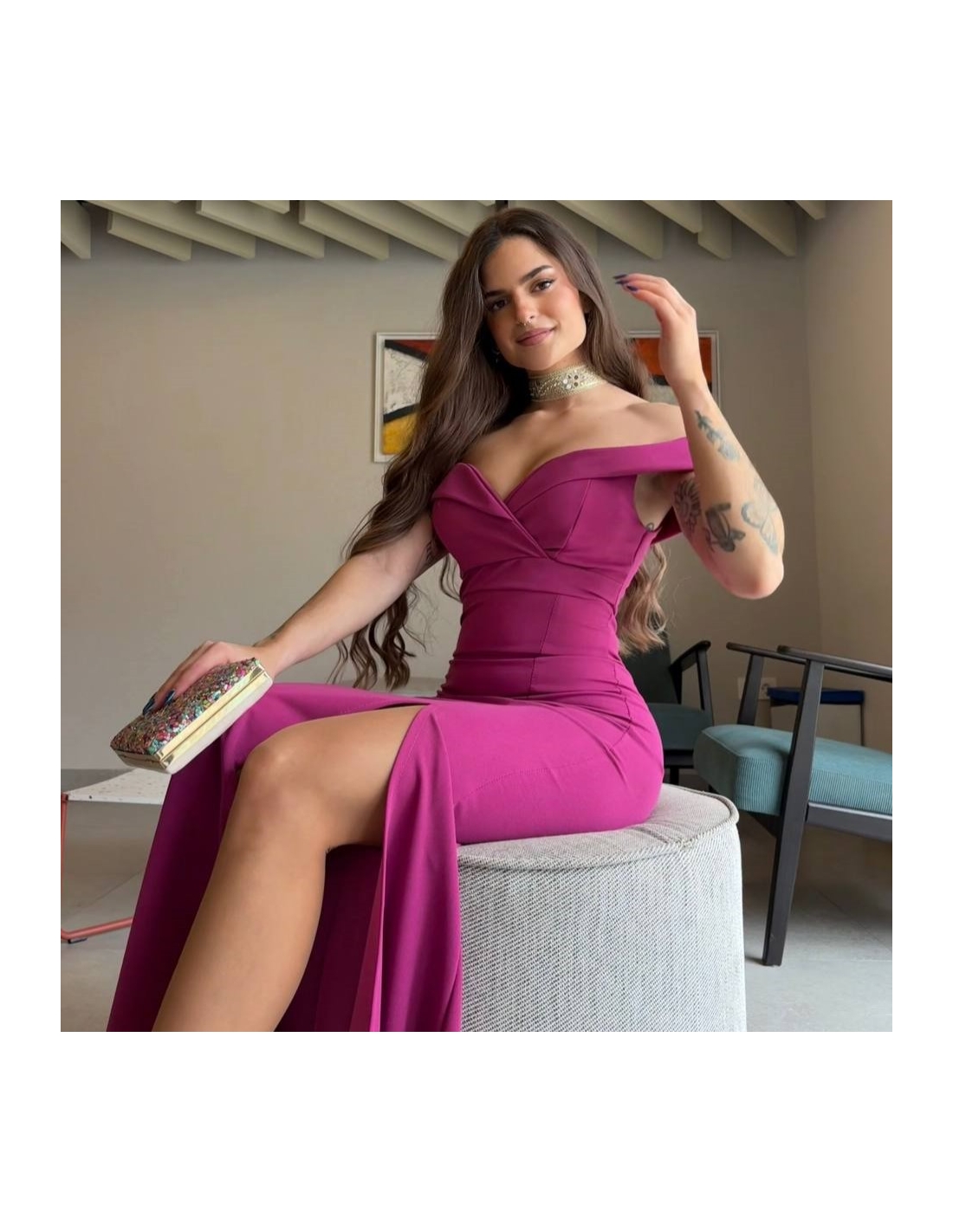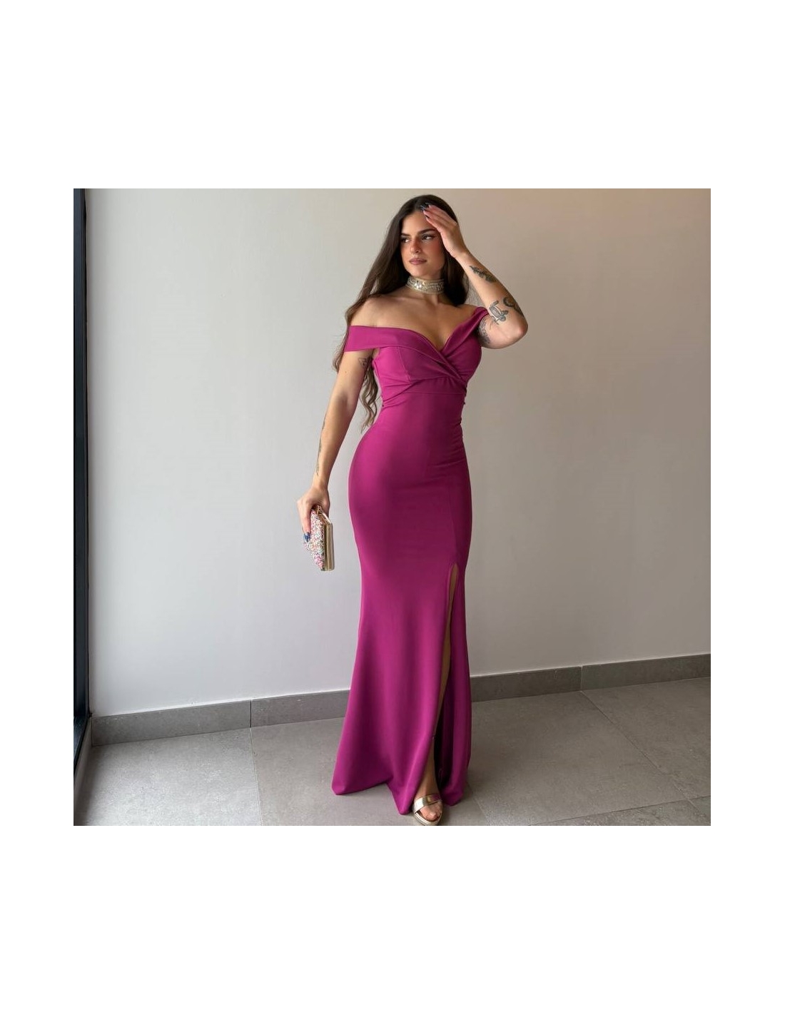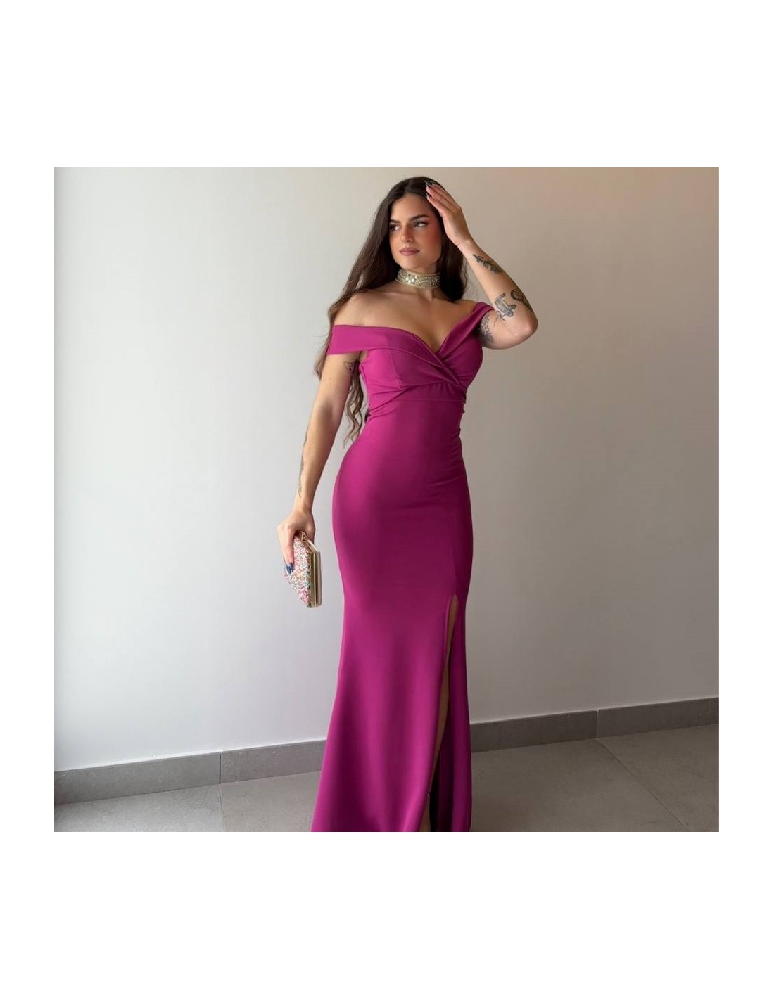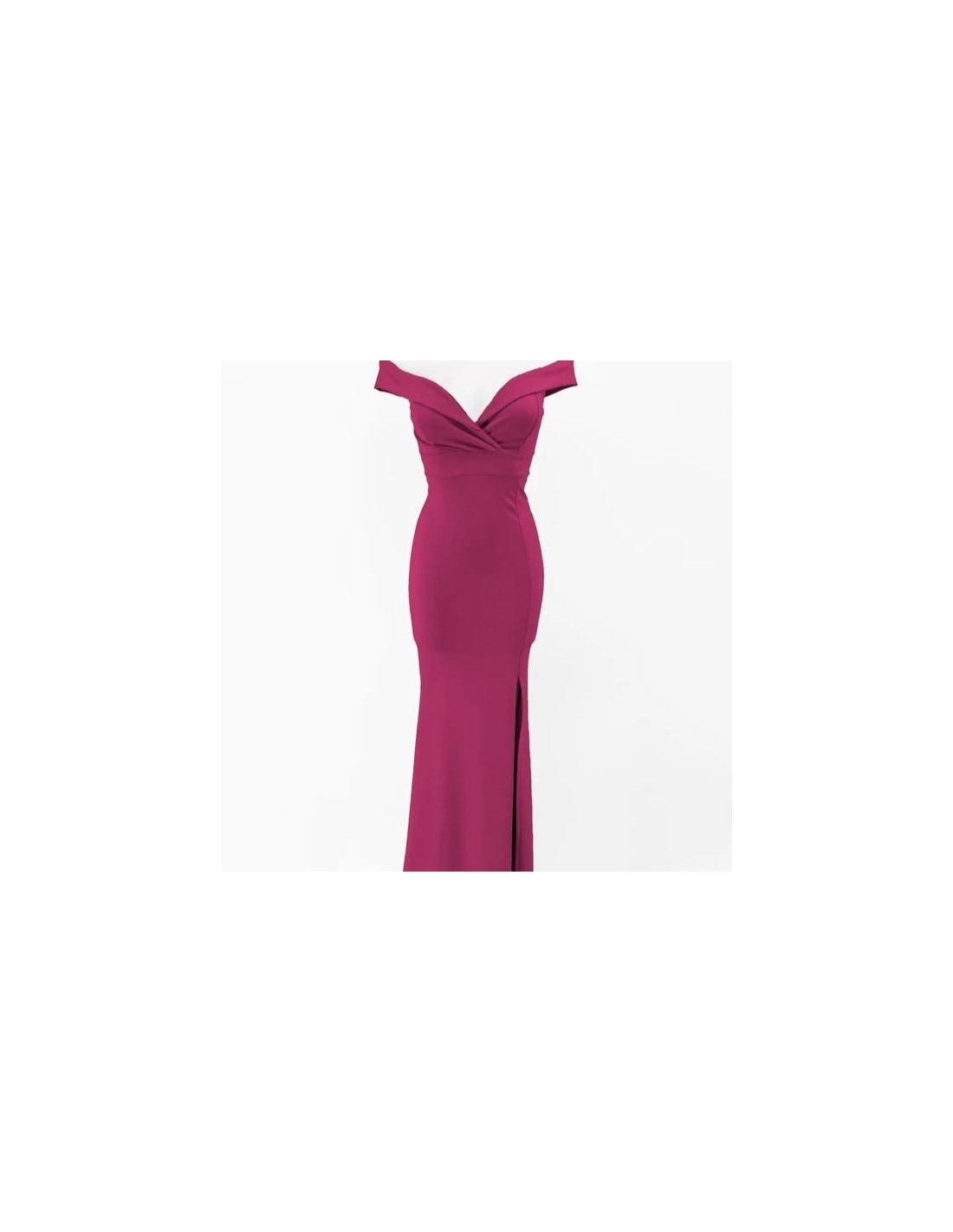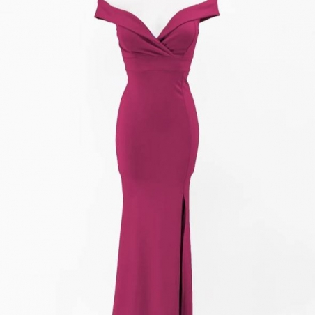 Vestido evento escote barco largo. Cierre trasero con cremallera. Abertura delantera central. Con casco incorporado. Talla única
