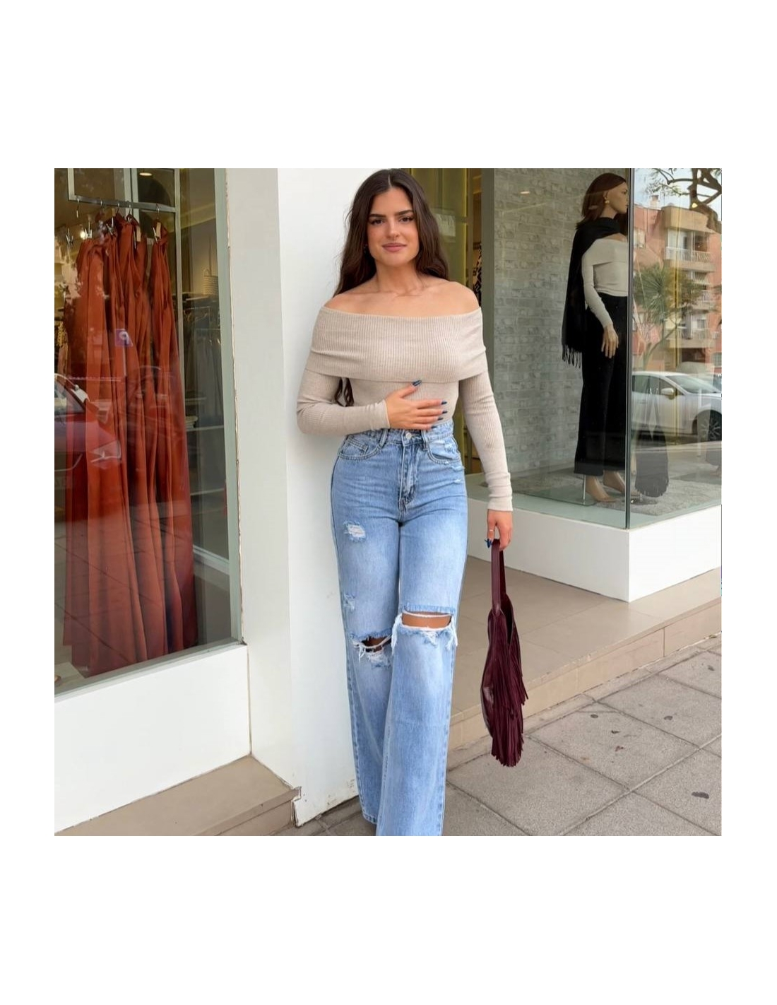 Jersey escote barco de punto. De manga larga. Elástico. Talla única.