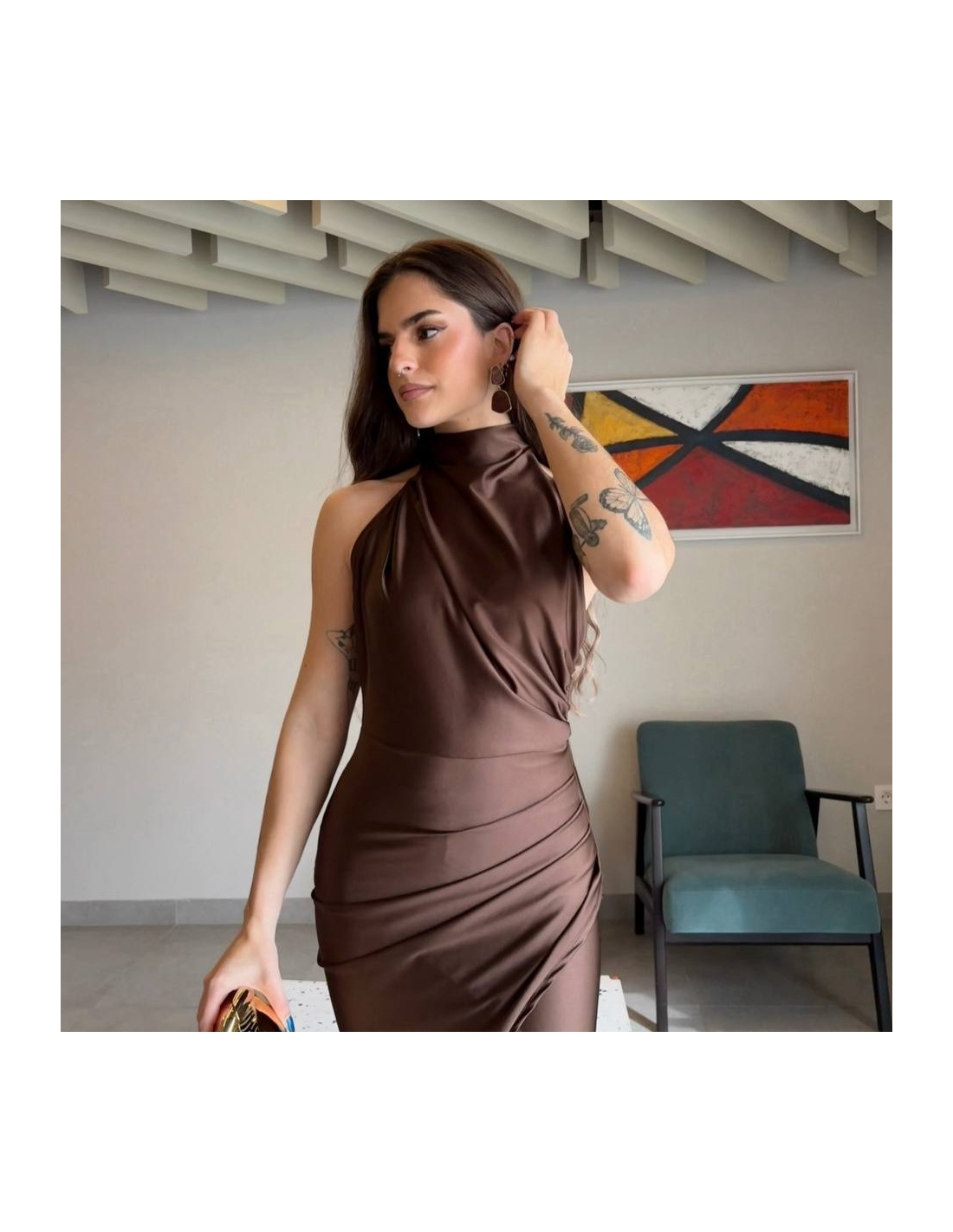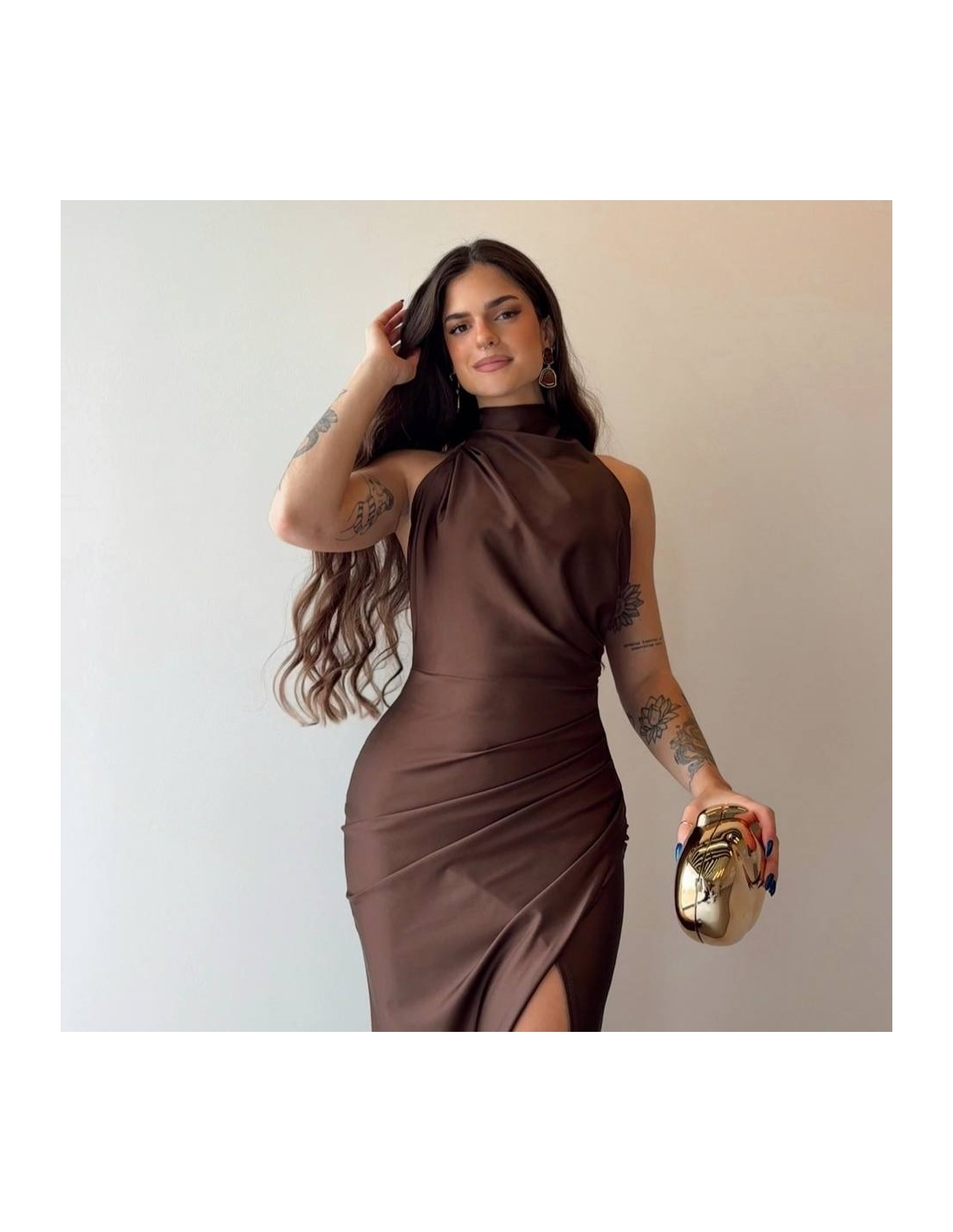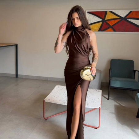 Vestido halter largo. Fruncido en parte delantera. Cierre trasero con cremallera oculta. Talla única