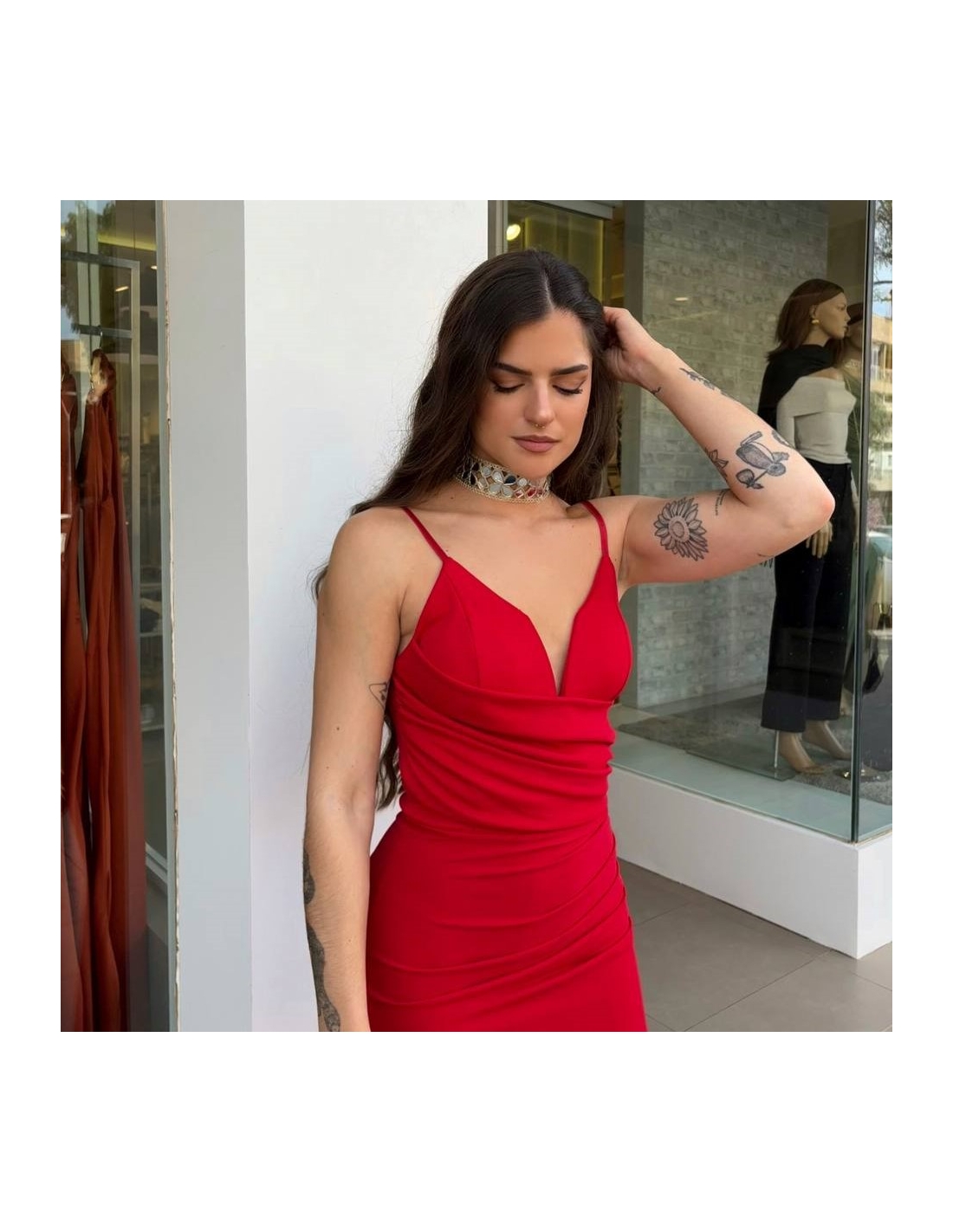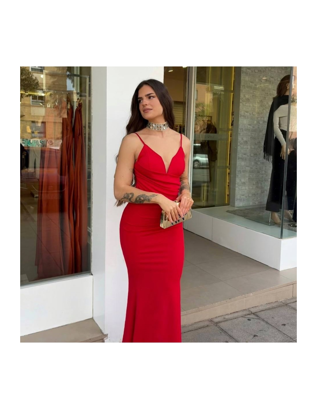 Vestido evento largo en tono rojo. Escote en V y casco incorporado. Con tirantas finas regulables. Fruncido en parte delantera. Talla única