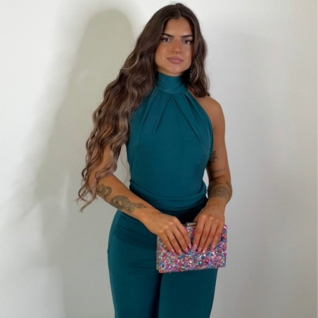 Mono halter de campana. Con lazada regulable en parte trasera a tono. Fruncido en parte delantera. Talla única.