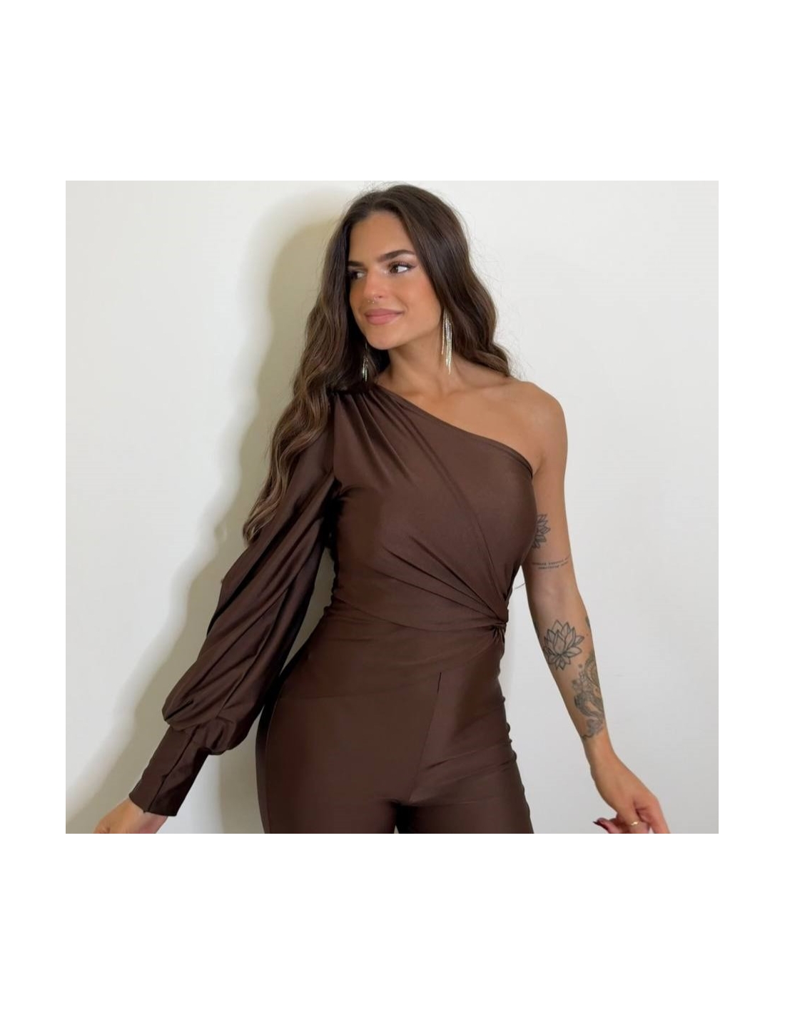 Mono asimétrico nudo. Tejido acabado satinado elástico. Abertura en manga. Cierre trasero con cremallera oculta. Talla única.
