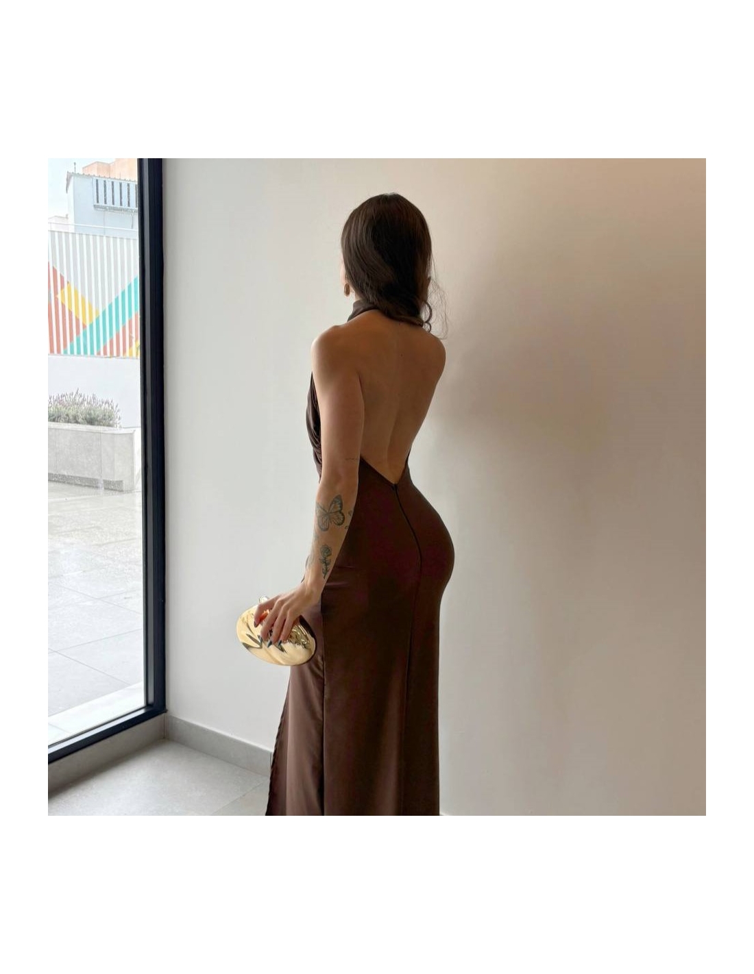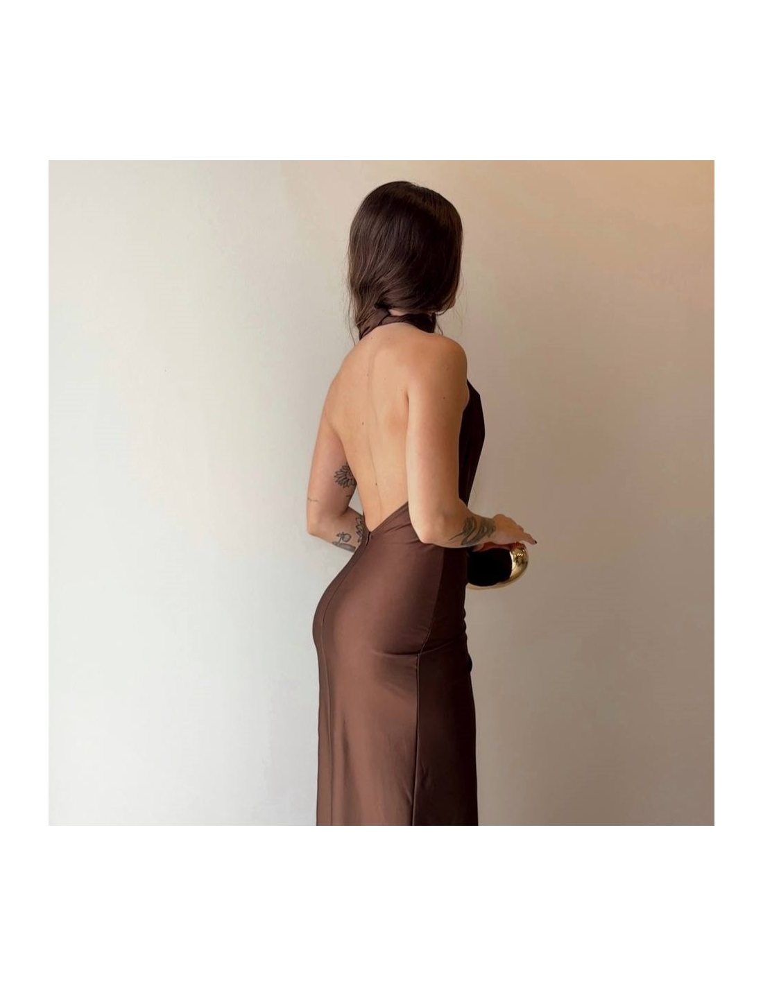 Vestido halter largo. Fruncido en parte delantera. Cierre trasero con cremallera oculta. Talla única