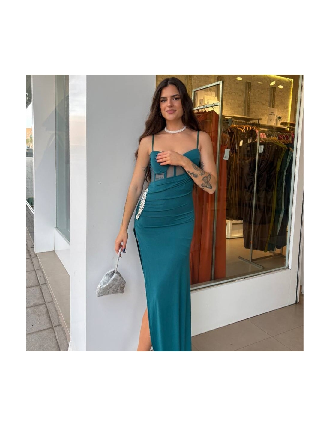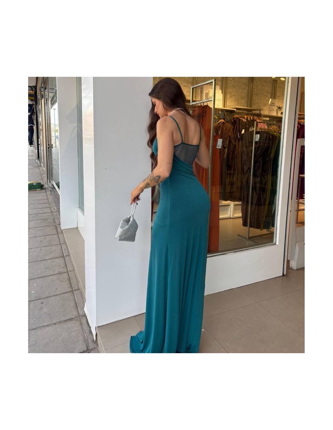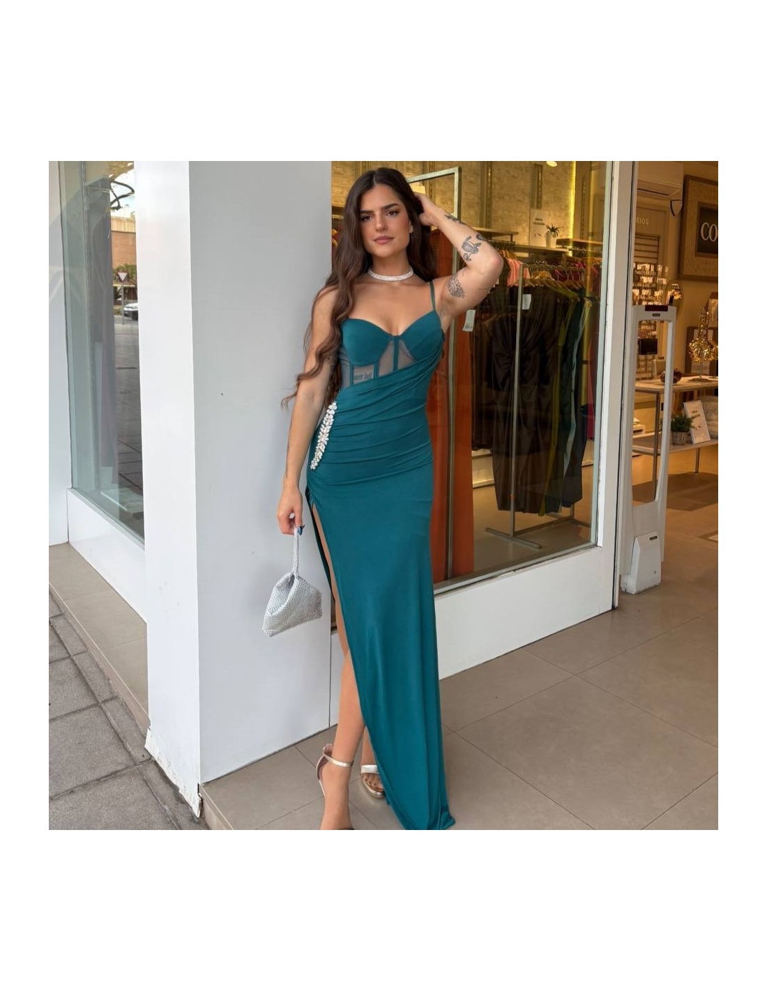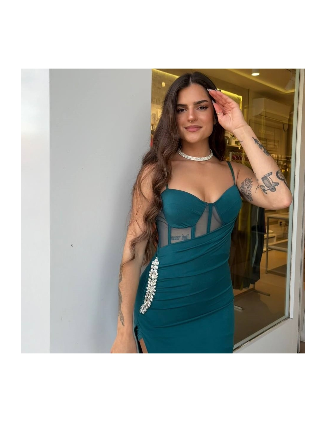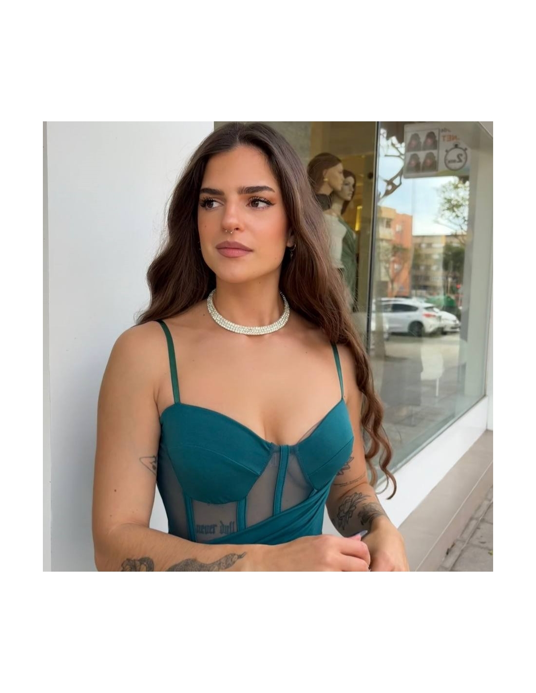 Vestido corset de tul con tiranta fina regulable a tono. Detalle joya en lateral fruncido. Talla única.