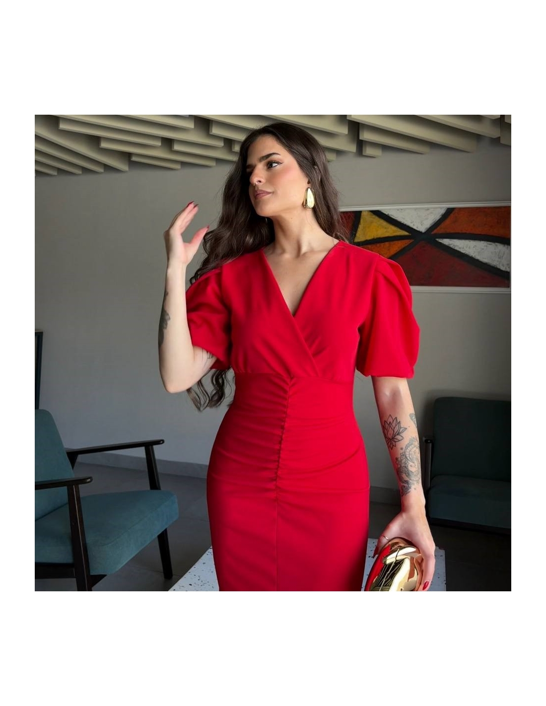 Vestido evento midi. De manga abullonada. Fruncido delantero. Escote en V. Talla única