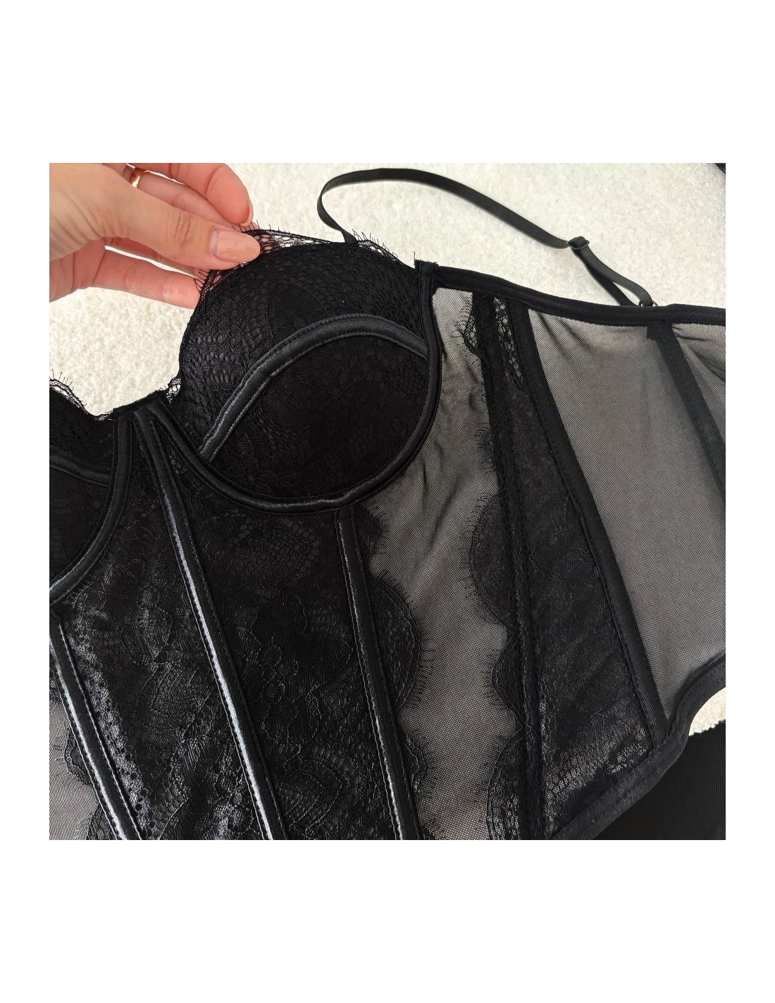 Corset encaje negro con tiranta regulable. Cierre trasero con corchetes ajustables. Talla única.