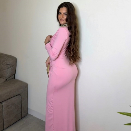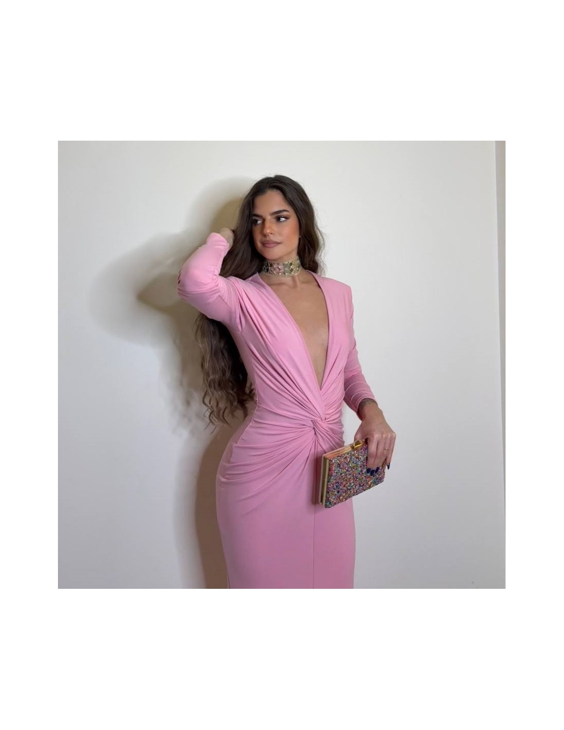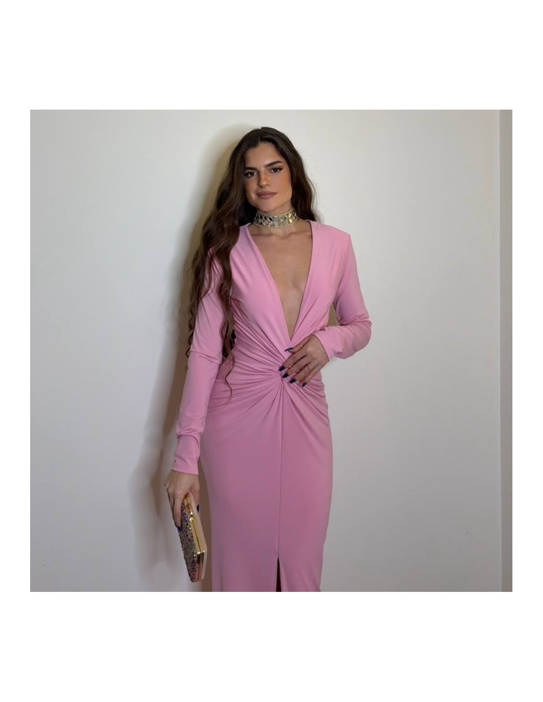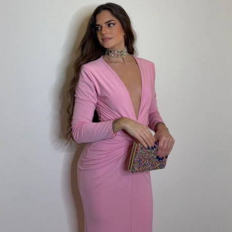Vestido evento largo con hombreras y nudo delantero fruncido. De manga larga. Escote V. Talla única.