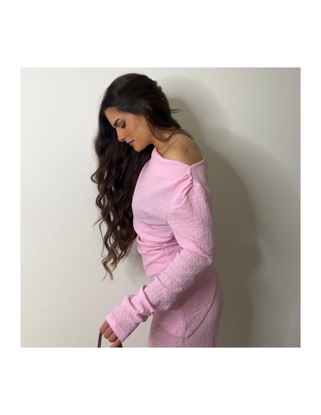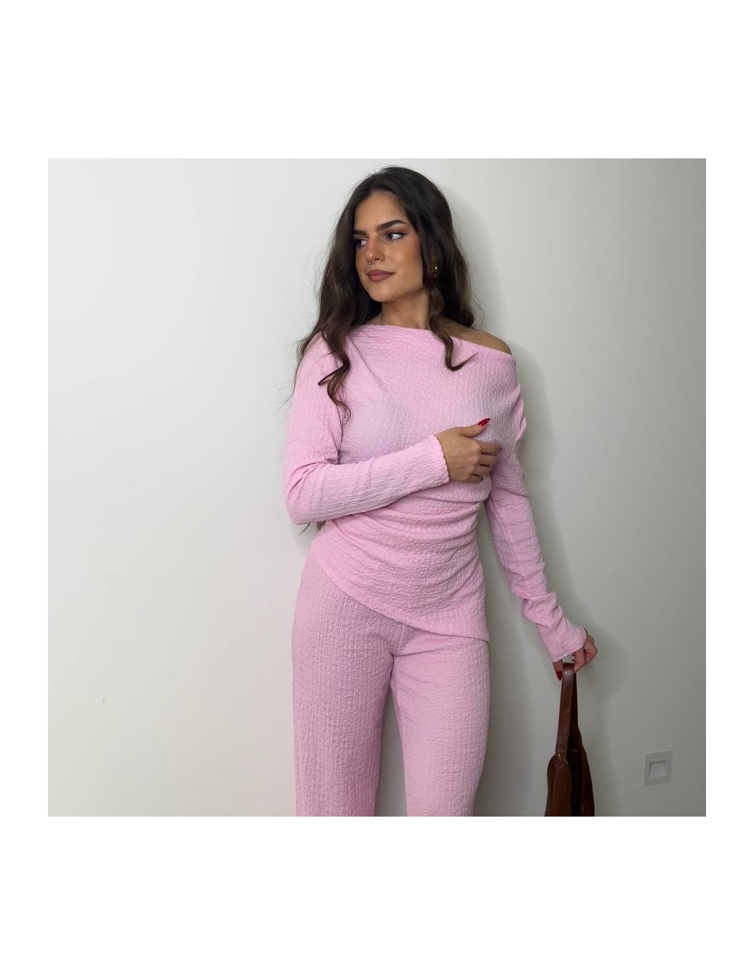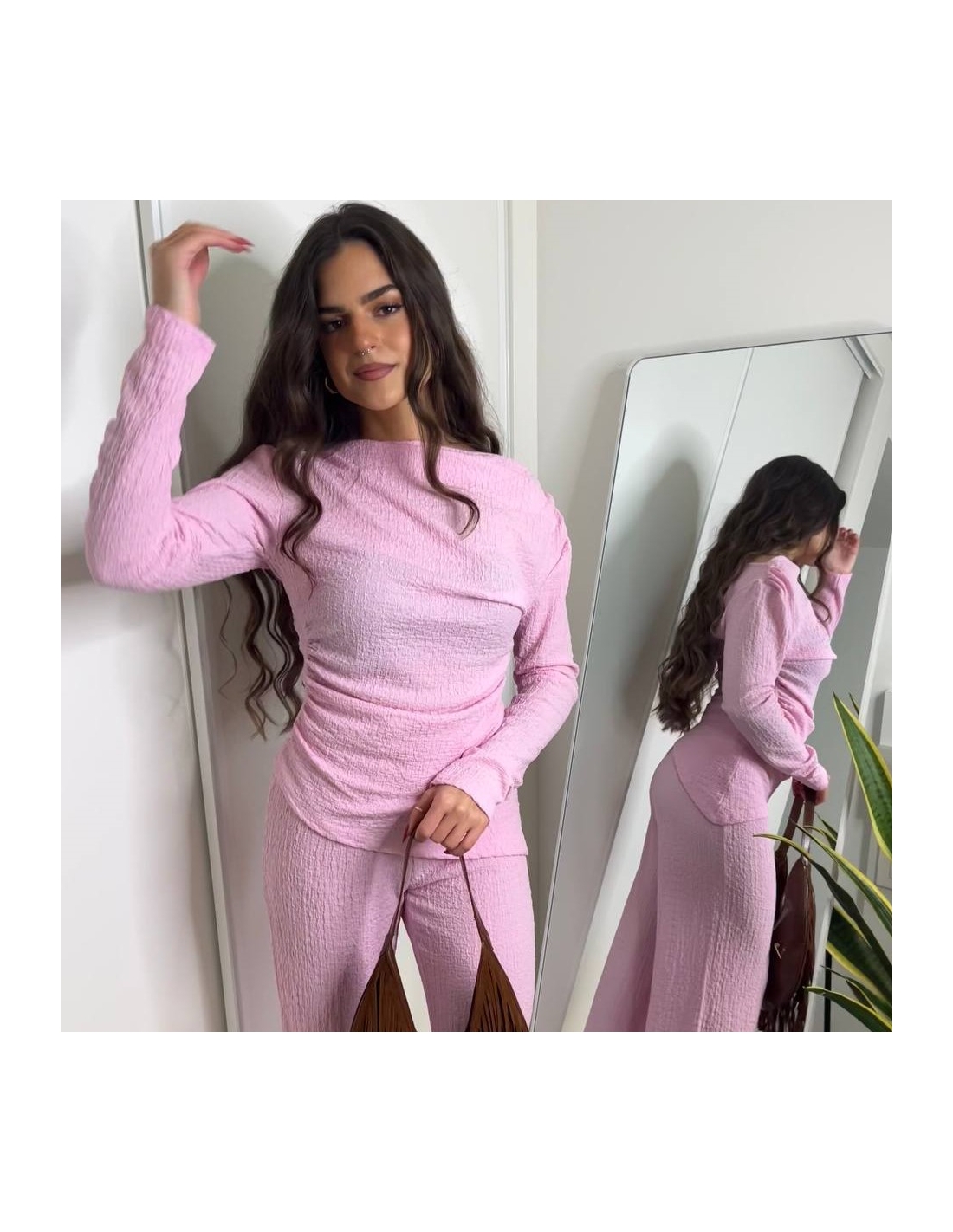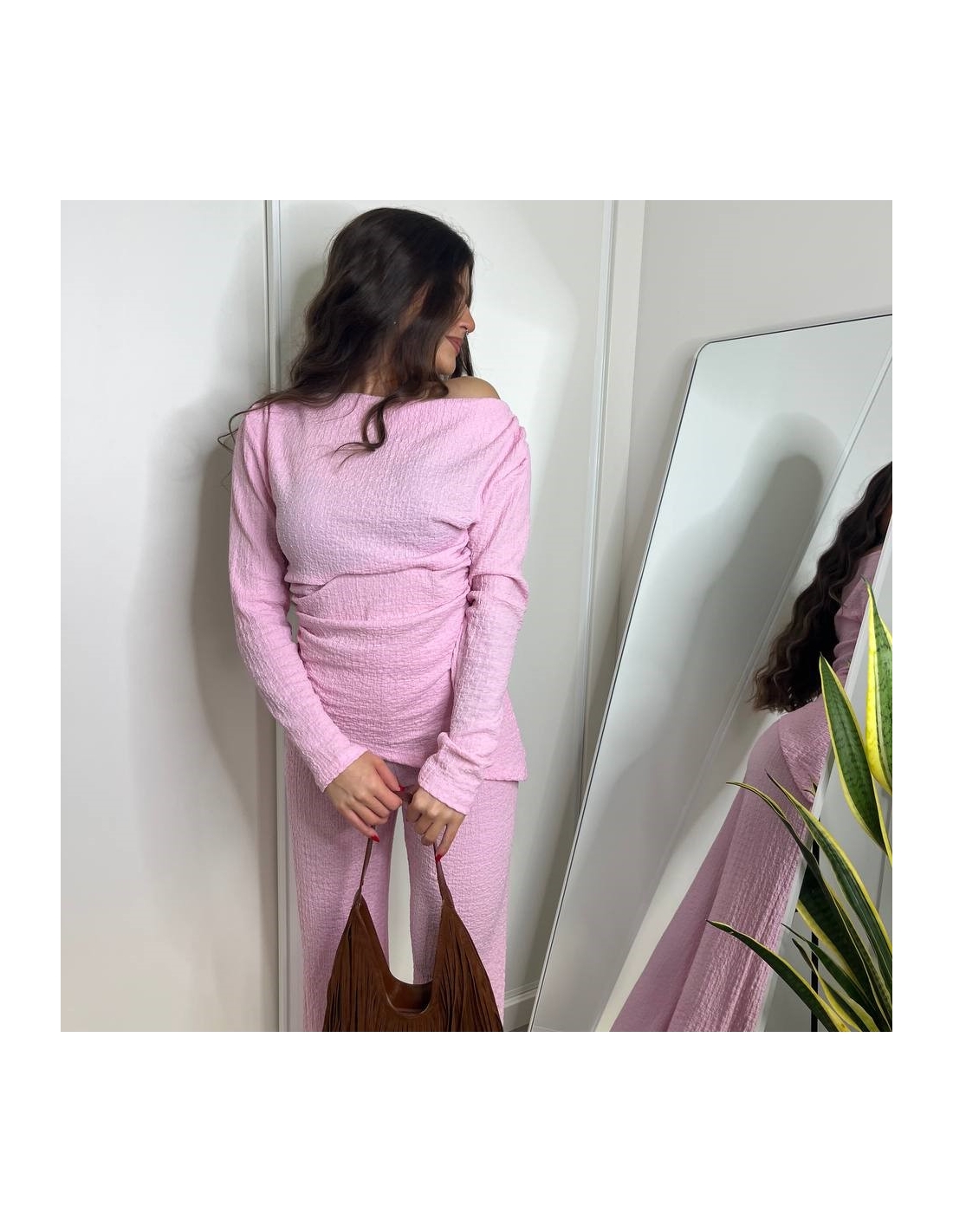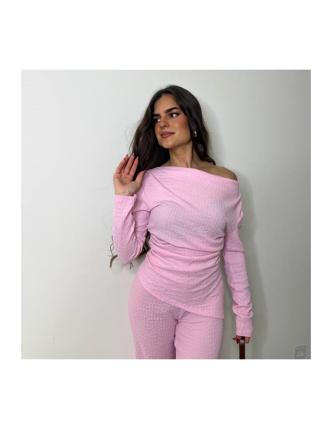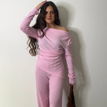 Conjunto de top más pantalón. Top con escote asimétrico, fruncido y manga larga. Pantalón de tiro alta con cintura elástica y campana. Talla única