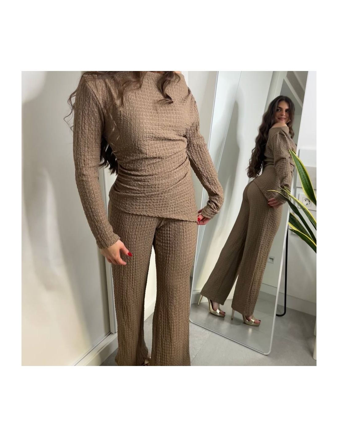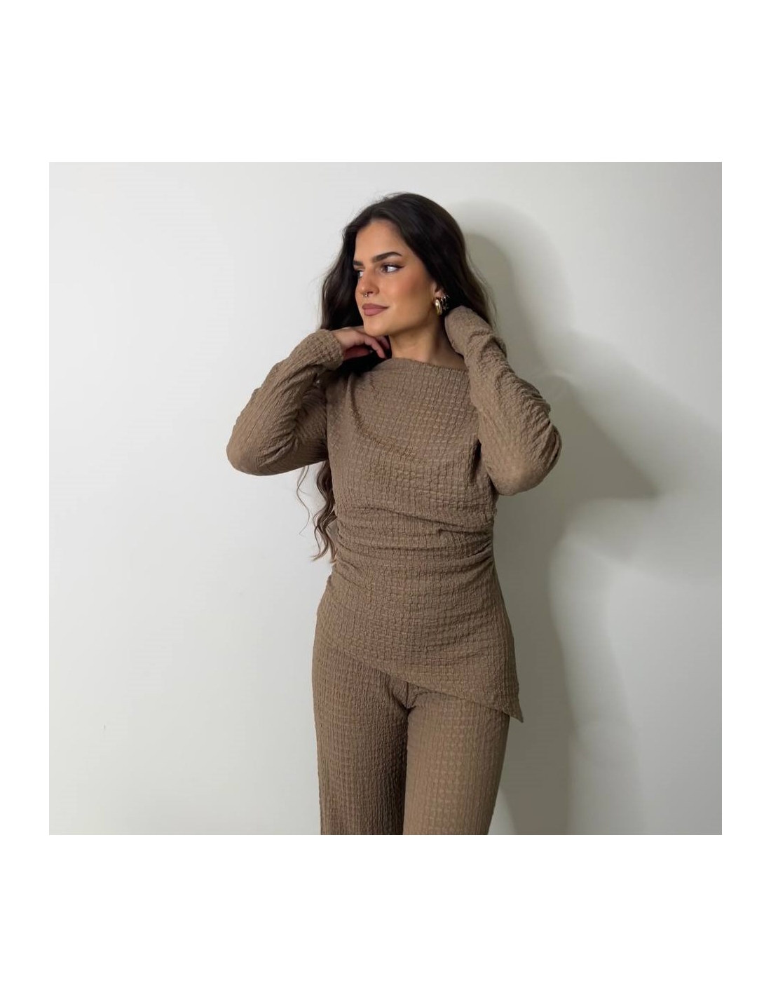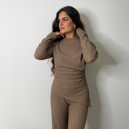 Conjunto de top más pantalón. Top con escote asimétrico, fruncido y manga larga. Pantalón de tiro alta con cintura elástica y campana. Talla única