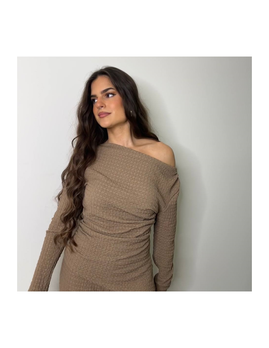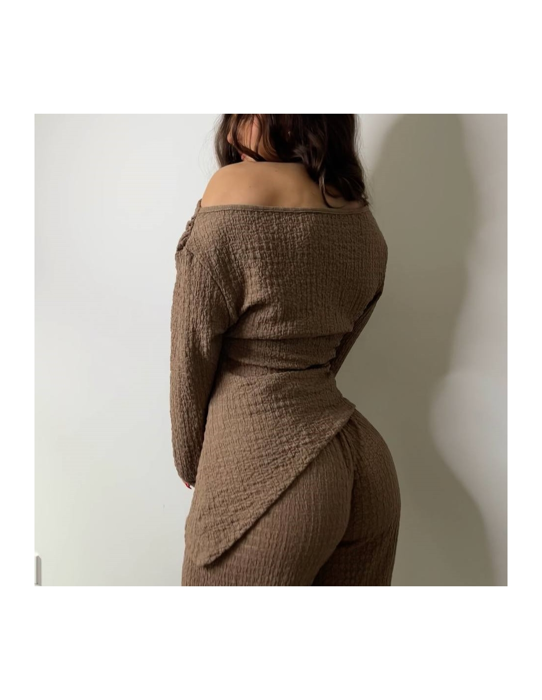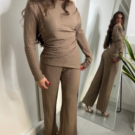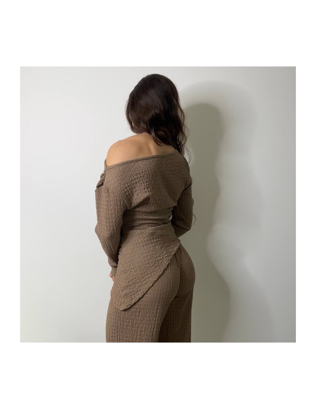 Conjunto de top más pantalón. Top con escote asimétrico, fruncido y manga larga. Pantalón de tiro alta con cintura elástica y campana. Talla única