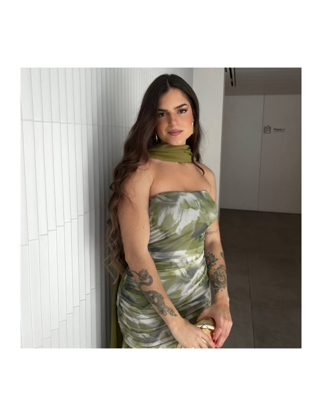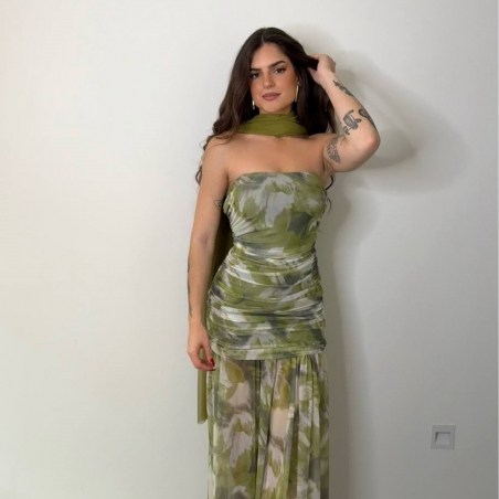 Vestido evento largo de tul estampado. Posibilidad de usar con tirantas finas regulables a tono. Fruncido. Con casco incorporado en el pecho. Talla única