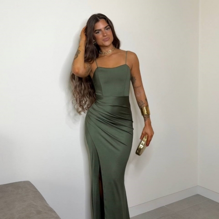 Vestido evento largo en tono verde caqui. Espalda cruzada regulable. Fruncido en parte delantera con fruncido. Elástico. Talla única