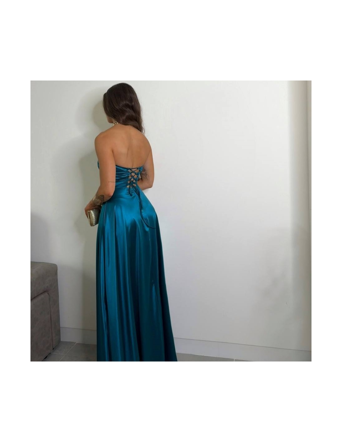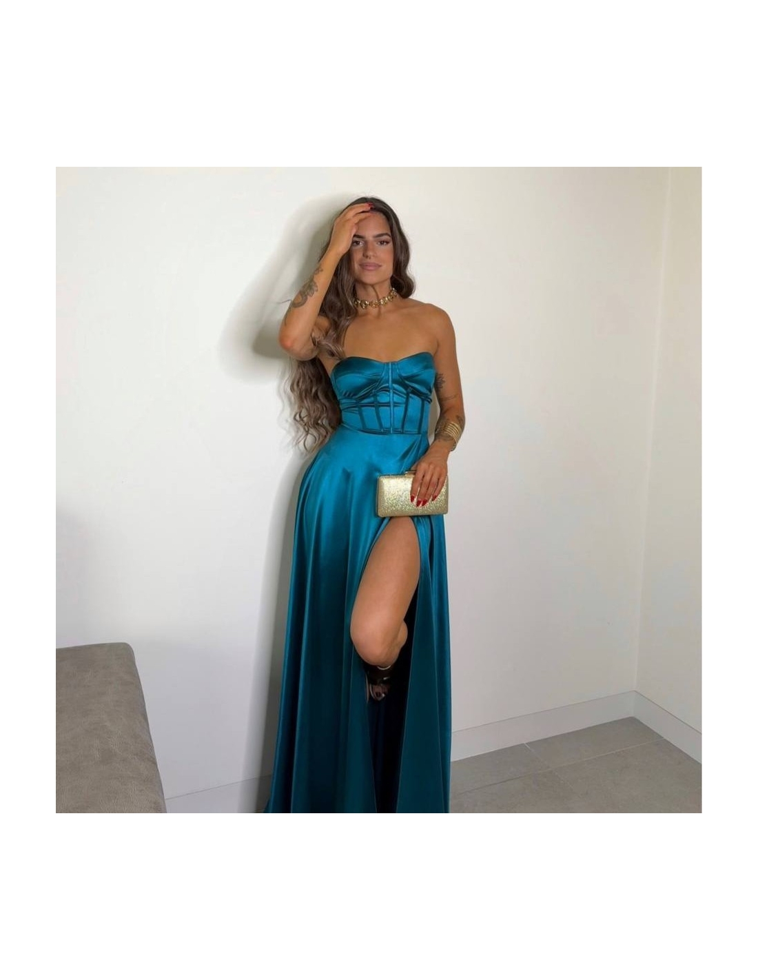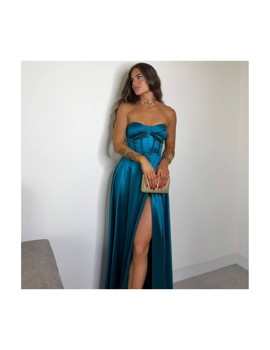 Vestido corset en tono petróleo. Casco incorporado. Fluido con abertura delantera. Talla única
