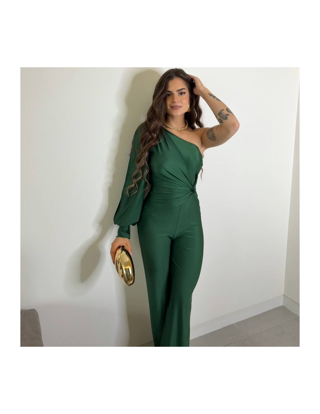 Mono asimétrico nudo. Tejido acabado satinado elástico. Abertura en manga. Cierre trasero con cremallera oculta. Talla única.