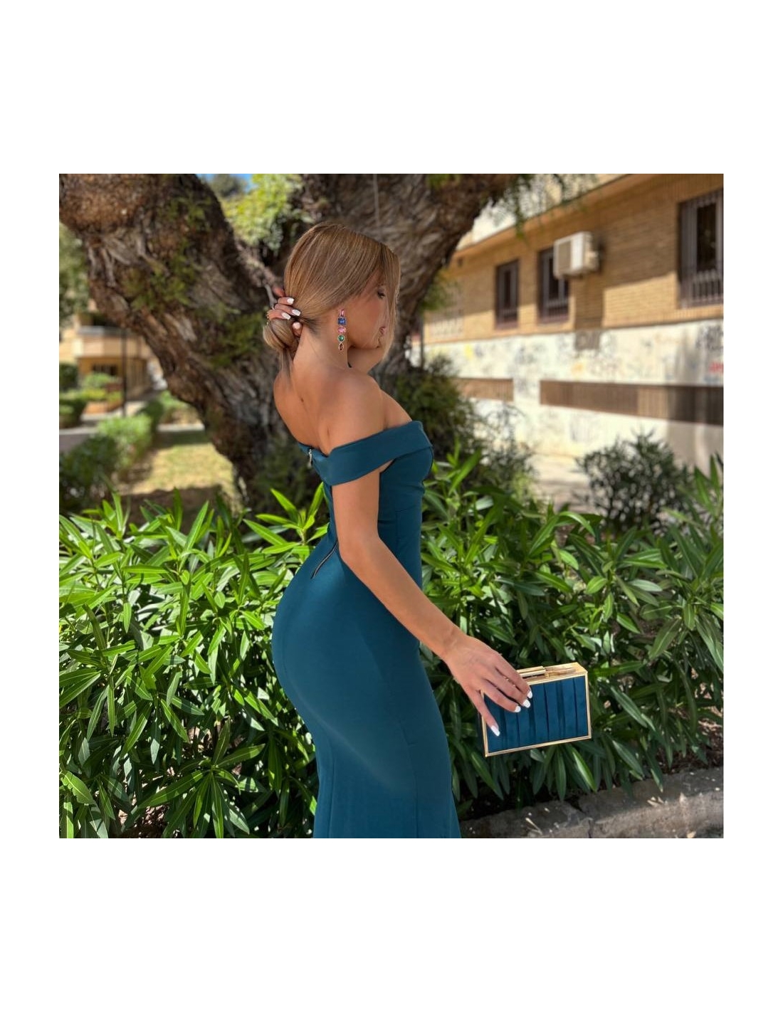 Vestido evento escote barco largo. Cierre trasero con cremallera. Abertura delantera central. Con casco incorporado. Talla única