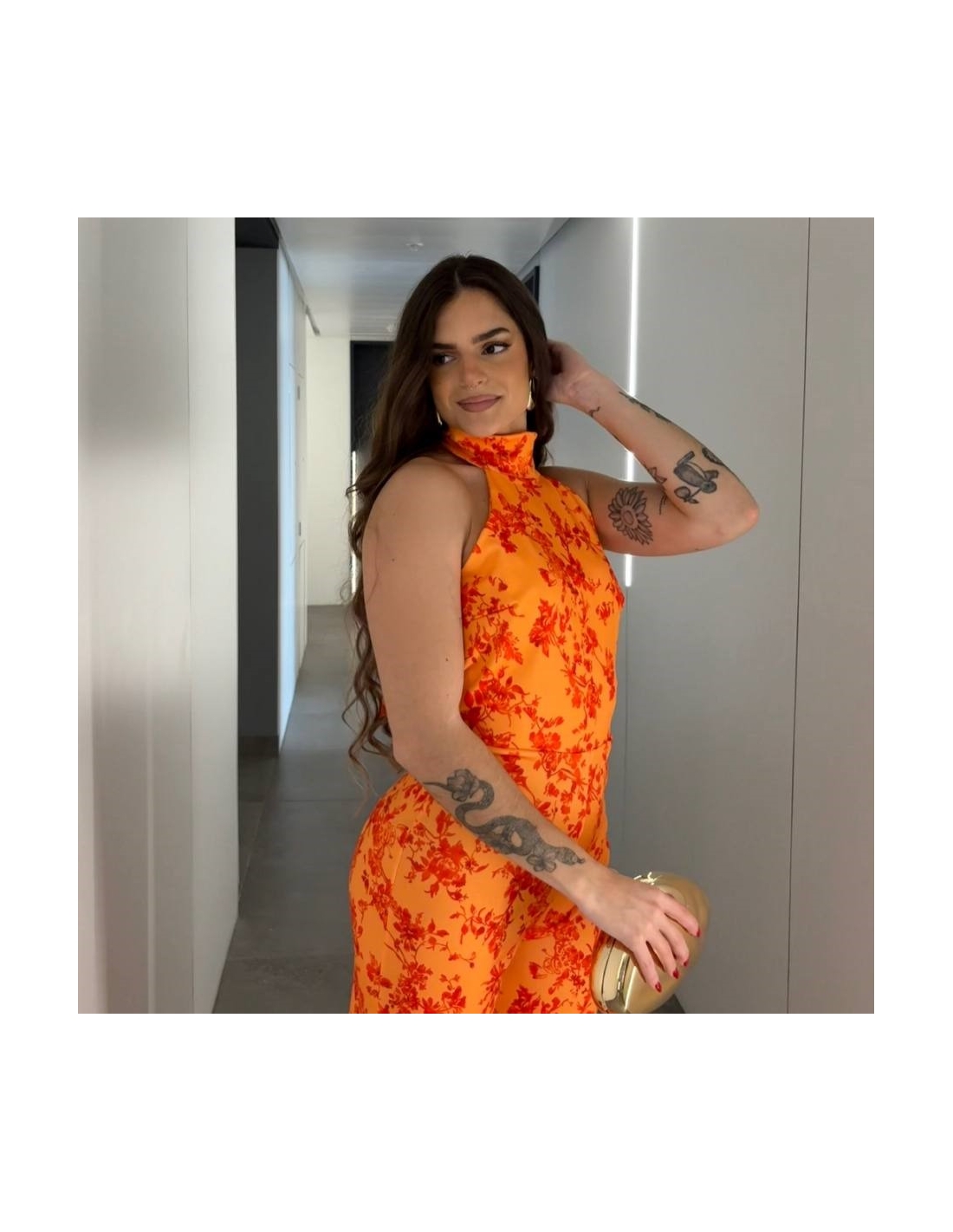 Mono largo campana con escote en espalda. Cuello halter. Posibilidad de lazada trasera. Talla única.