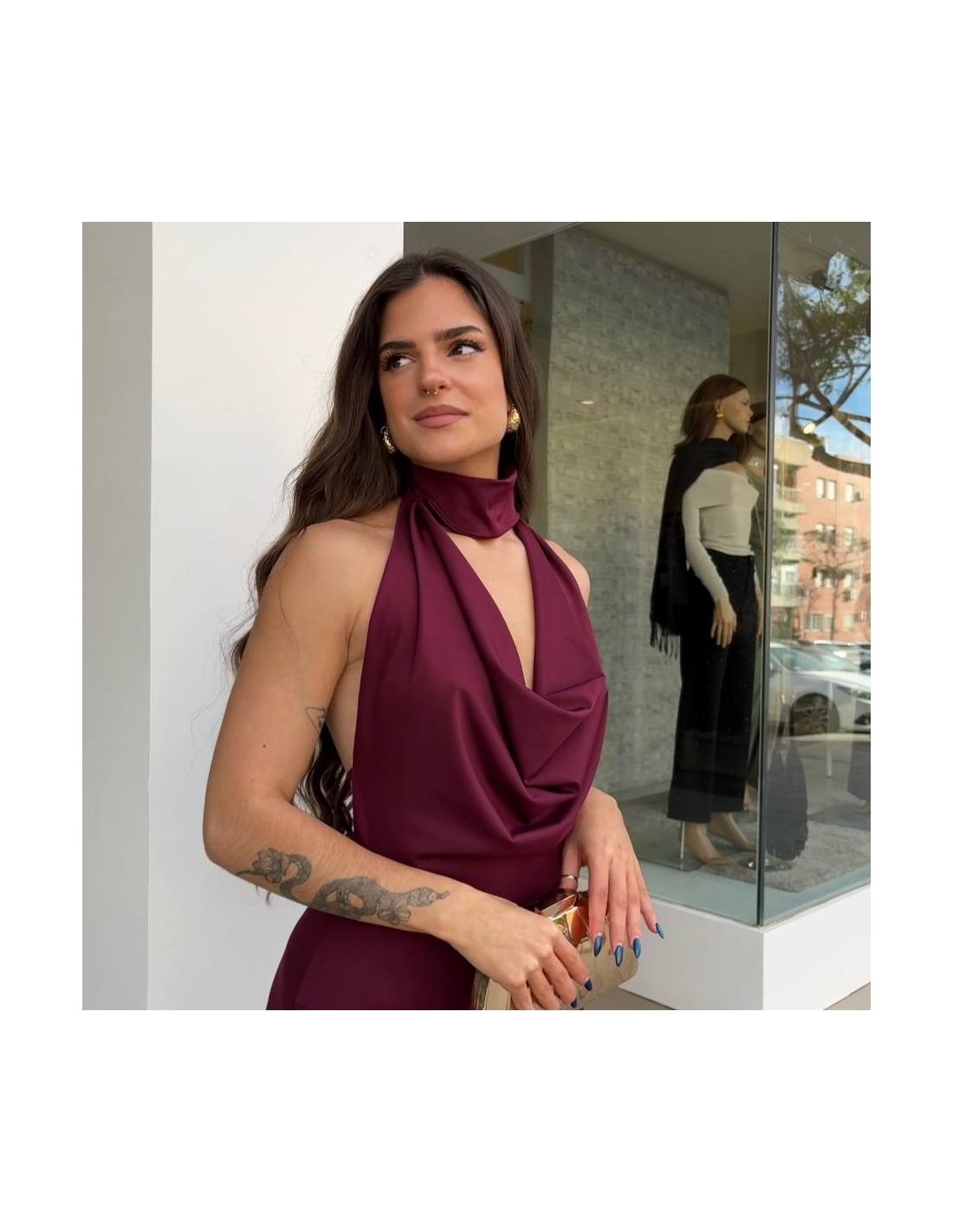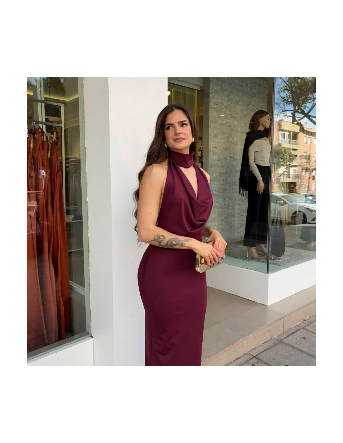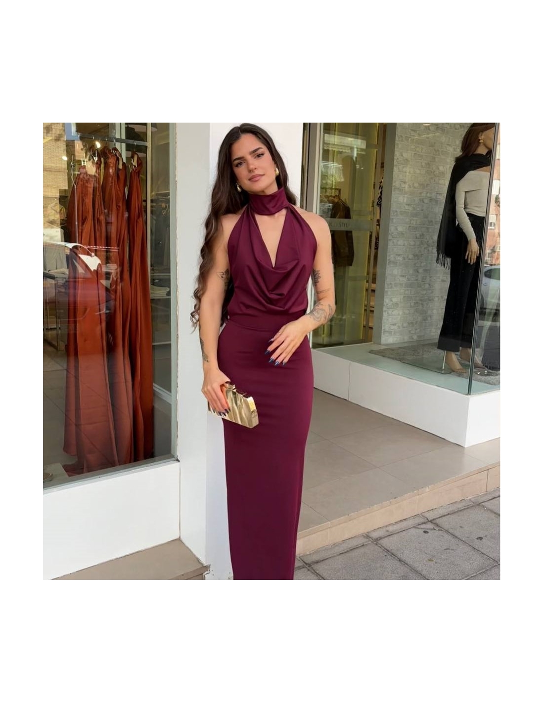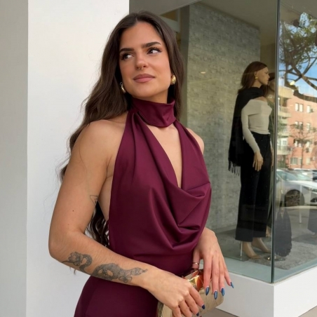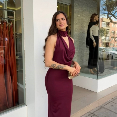 Vestido evento ajustado en tono burdeos. Cuello halter con gargantilla. Escote fluido. Lazada mini regulable trasera a tono. Elástico. Talla única