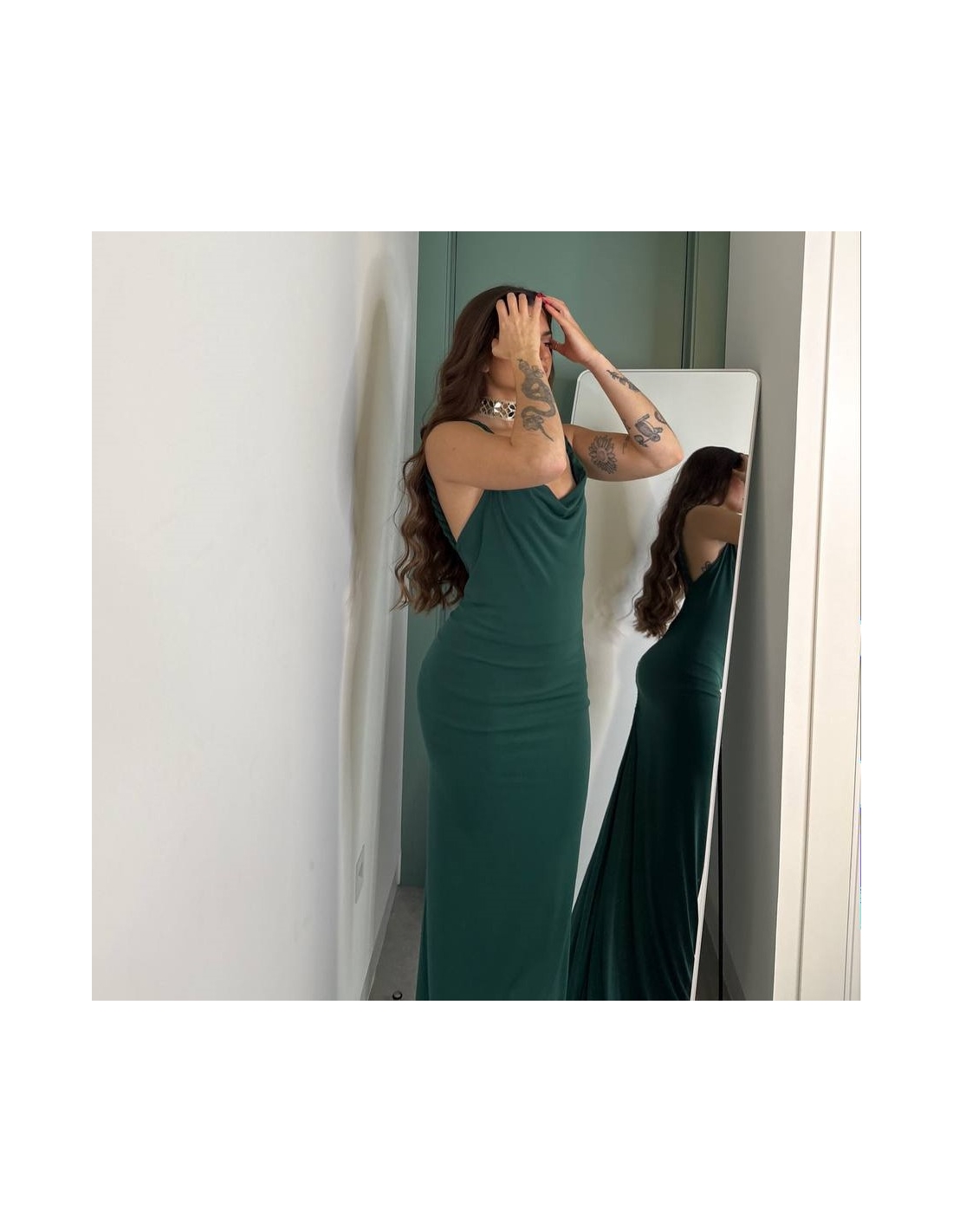 Vestido evento largo en tono verde botella. Tirantas trenzadas a tono. Fruncido en parte trasera. Escote fluido. Elástico. Doble tejido. Talla única