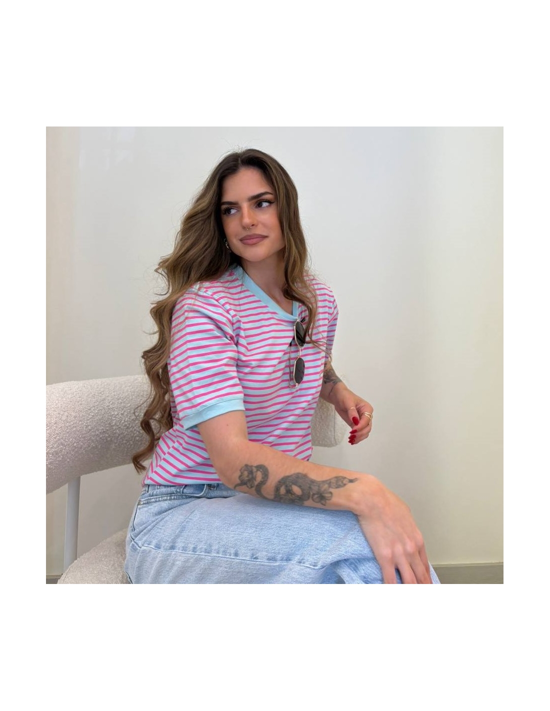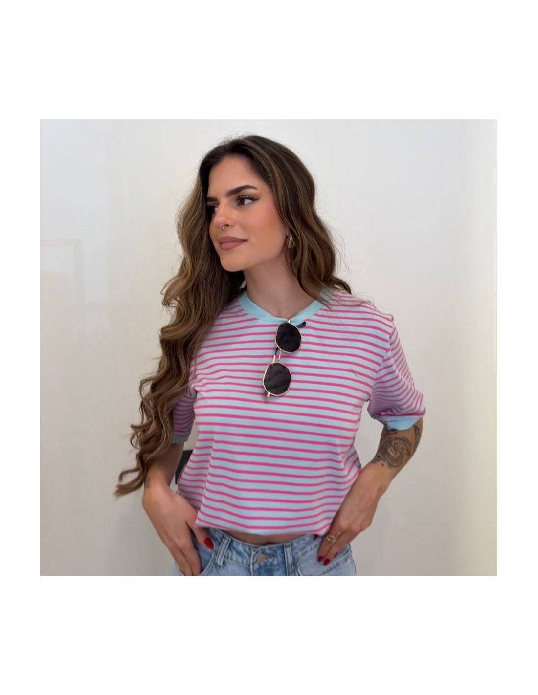 Camiseta de rayas de manga corta. Cuello redondo. Elástica. Talla única