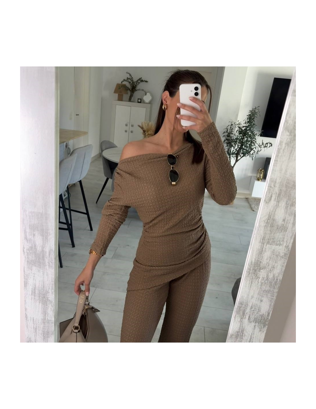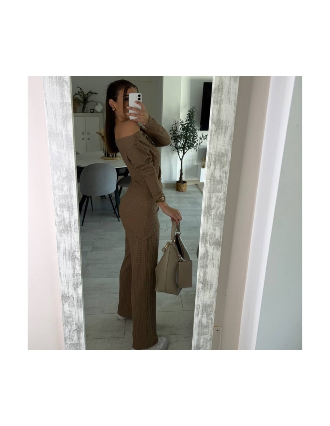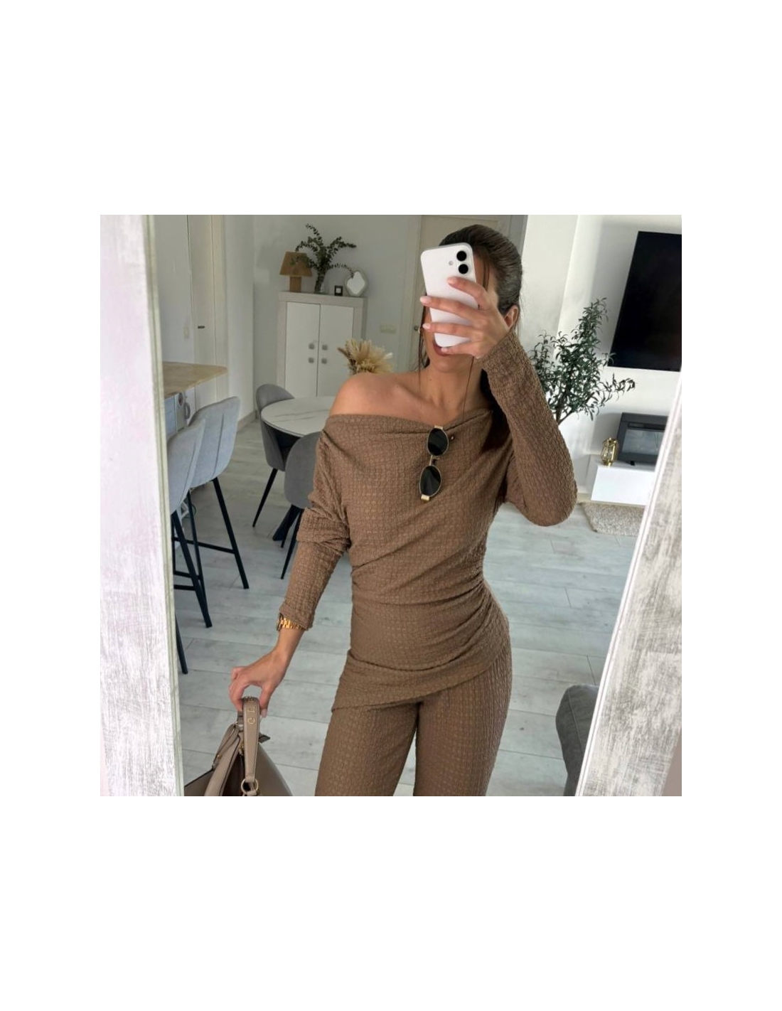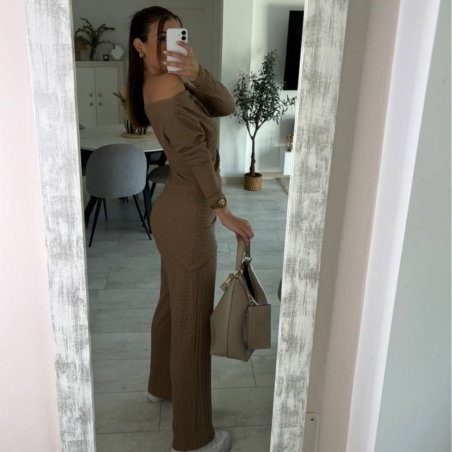 Conjunto de top más pantalón. Top con escote asimétrico, fruncido y manga larga. Pantalón de tiro alta con cintura elástica y campana. Talla única