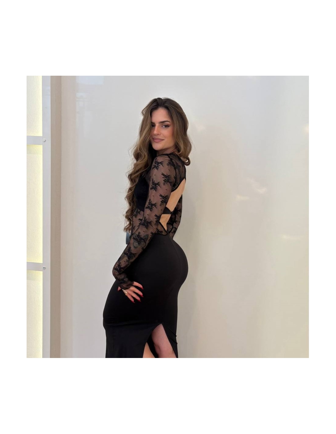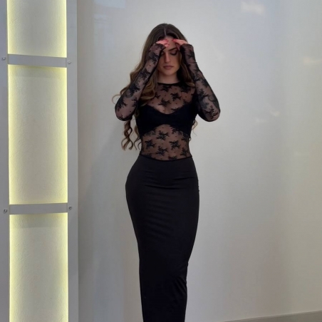 Vestido encaje largo de manga larga. Banda incorporada en la zona del pecho y cierre trasero con botón. Elástico. Talla única