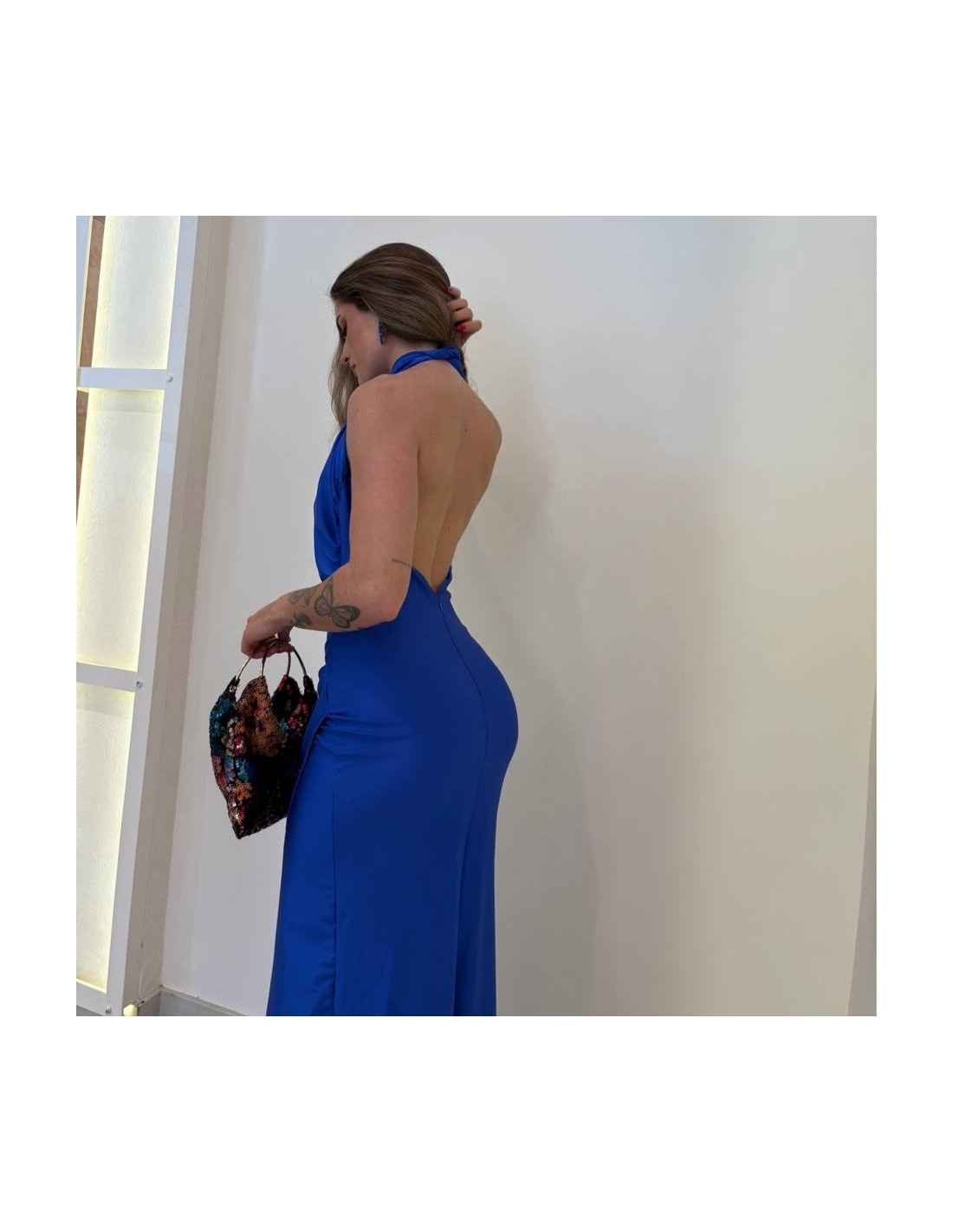Vestido halter largo. Fruncido en parte delantera. Cierre trasero con cremallera oculta. Talla única