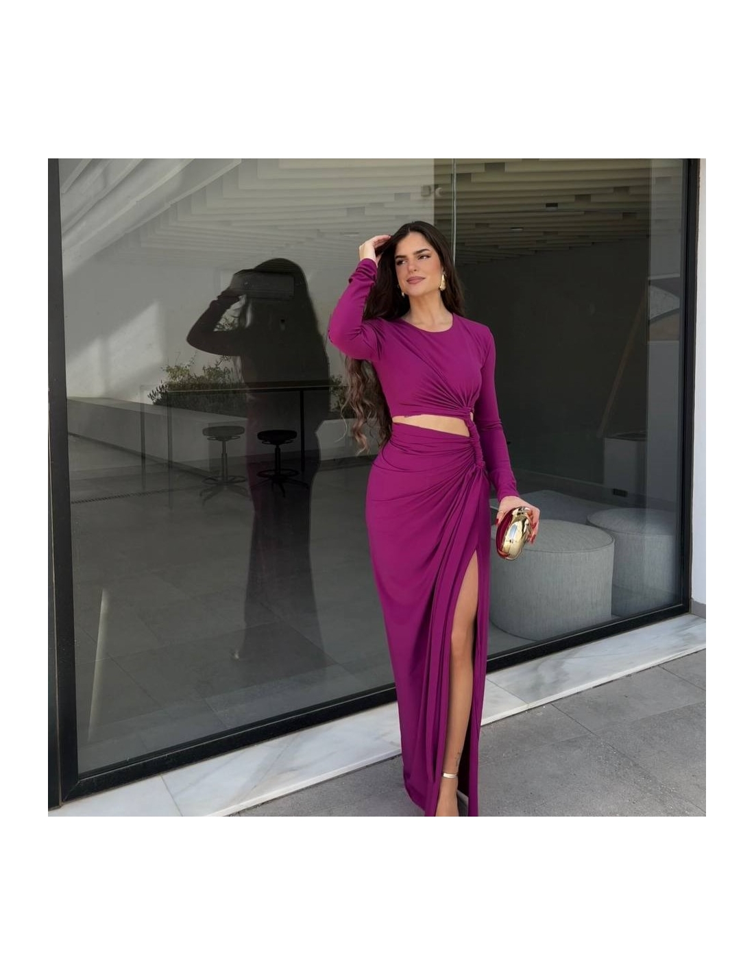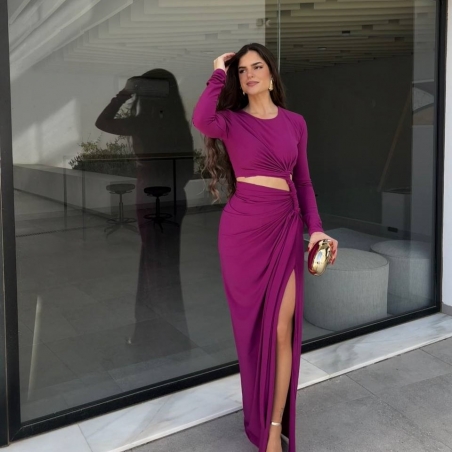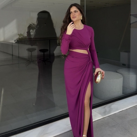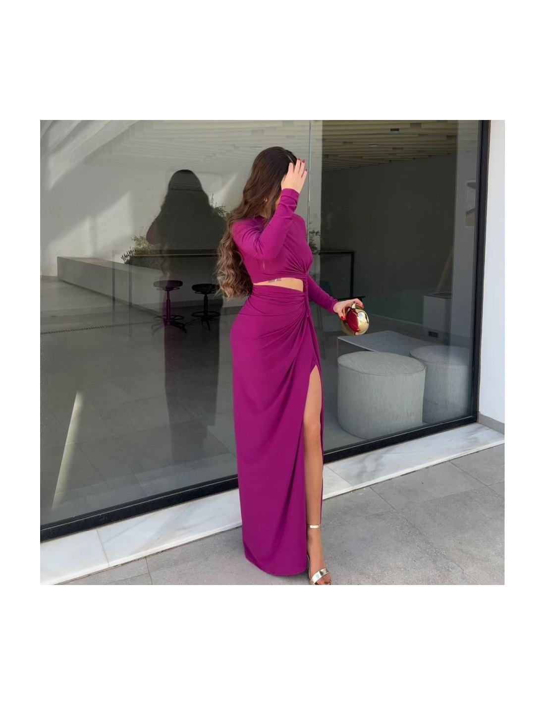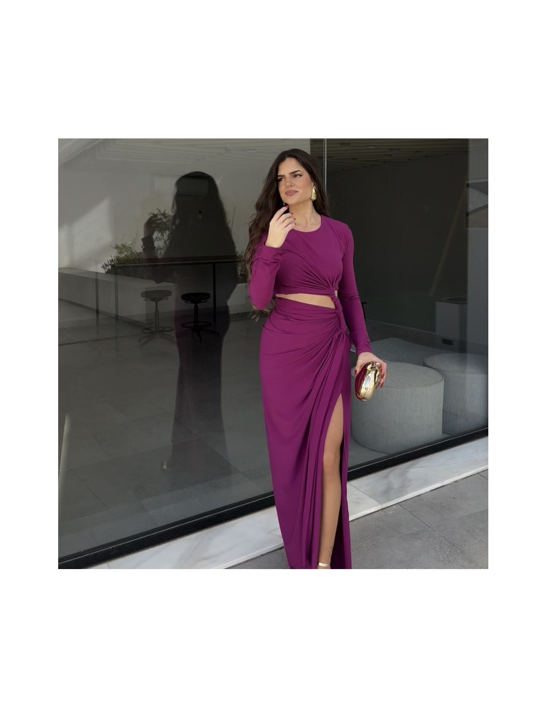 Vestido evento largo en tono buganvilla. De manga larga. Abertura delantera y conexión con parte baja del vestido. Abertura y fruncido. Talla única