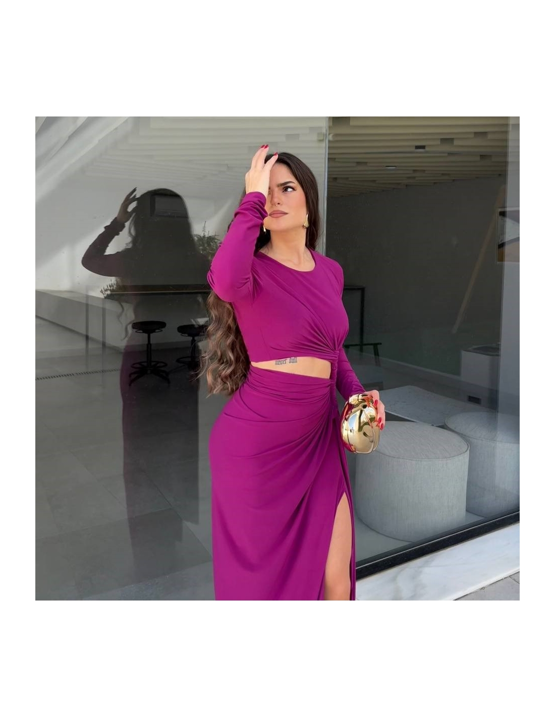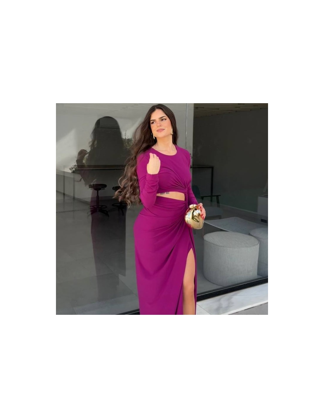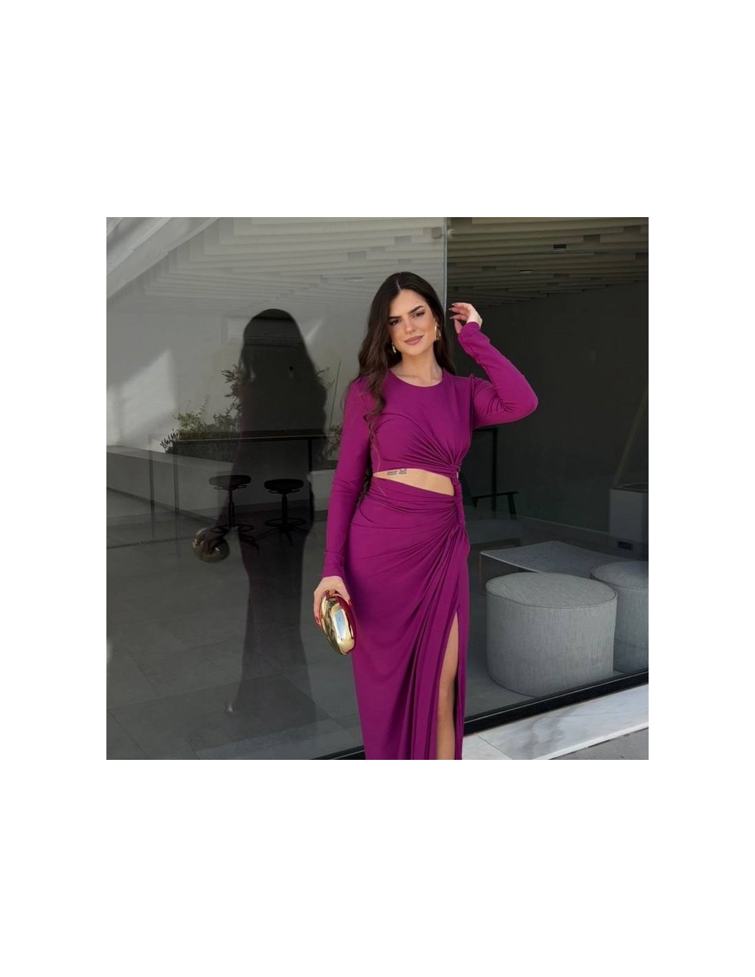 Vestido evento largo en tono buganvilla. De manga larga. Abertura delantera y conexión con parte baja del vestido. Abertura y fruncido. Talla única