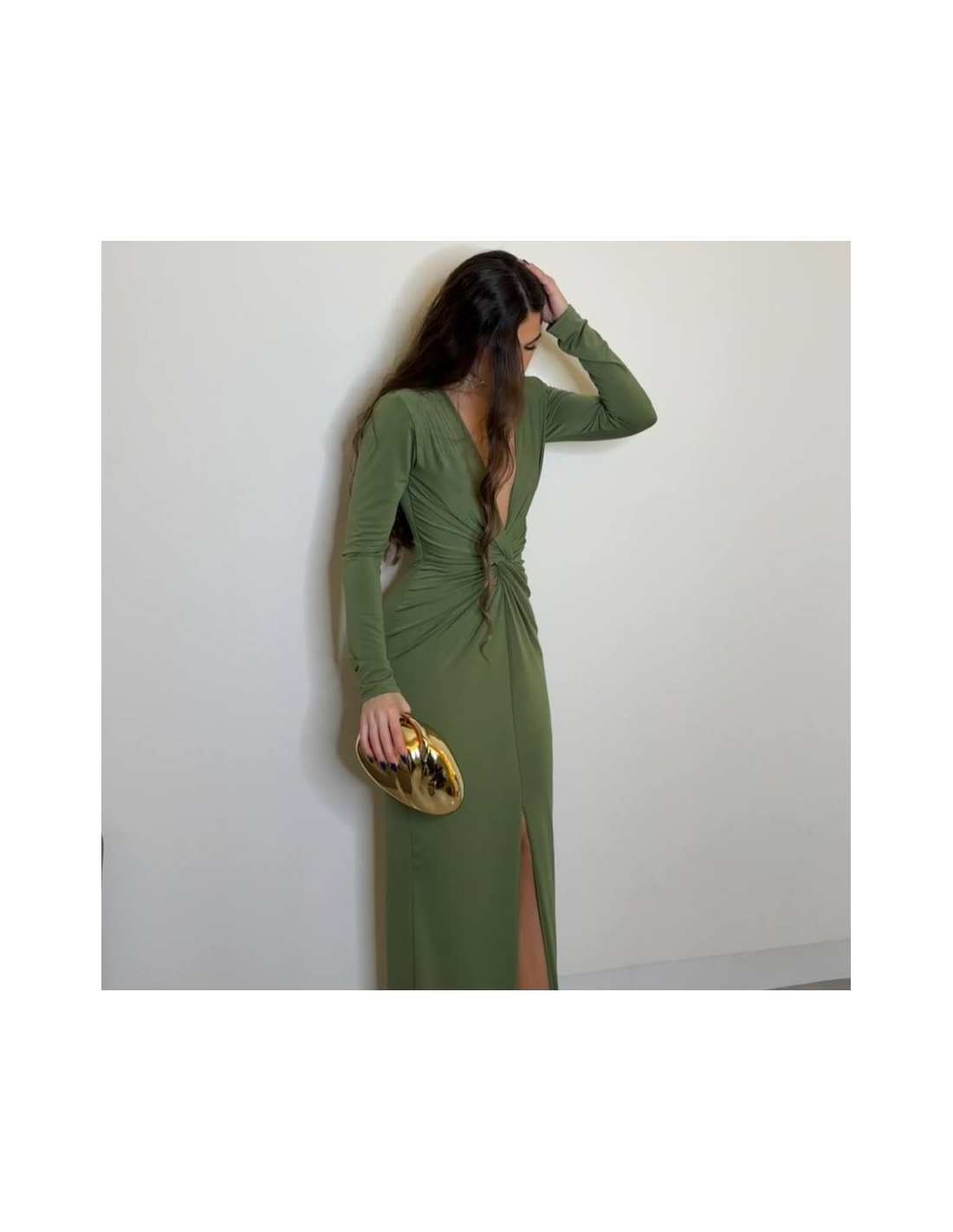Vestido evento largo con hombreras y nudo delantero fruncido. De manga larga. Escote V. Talla única.
