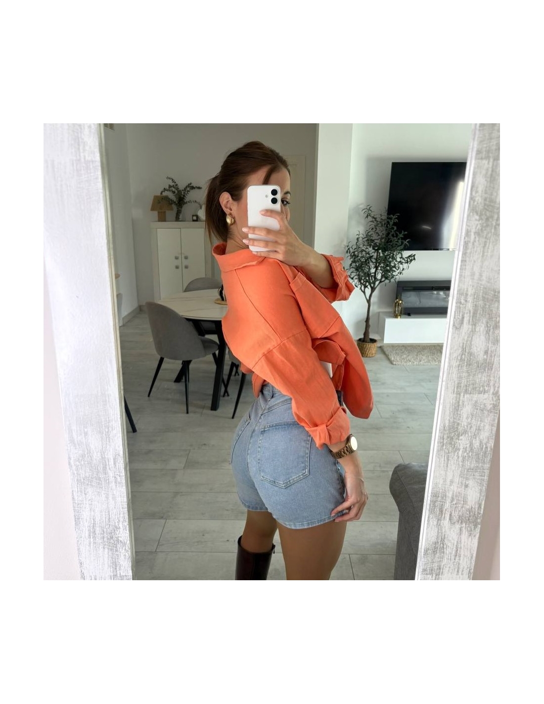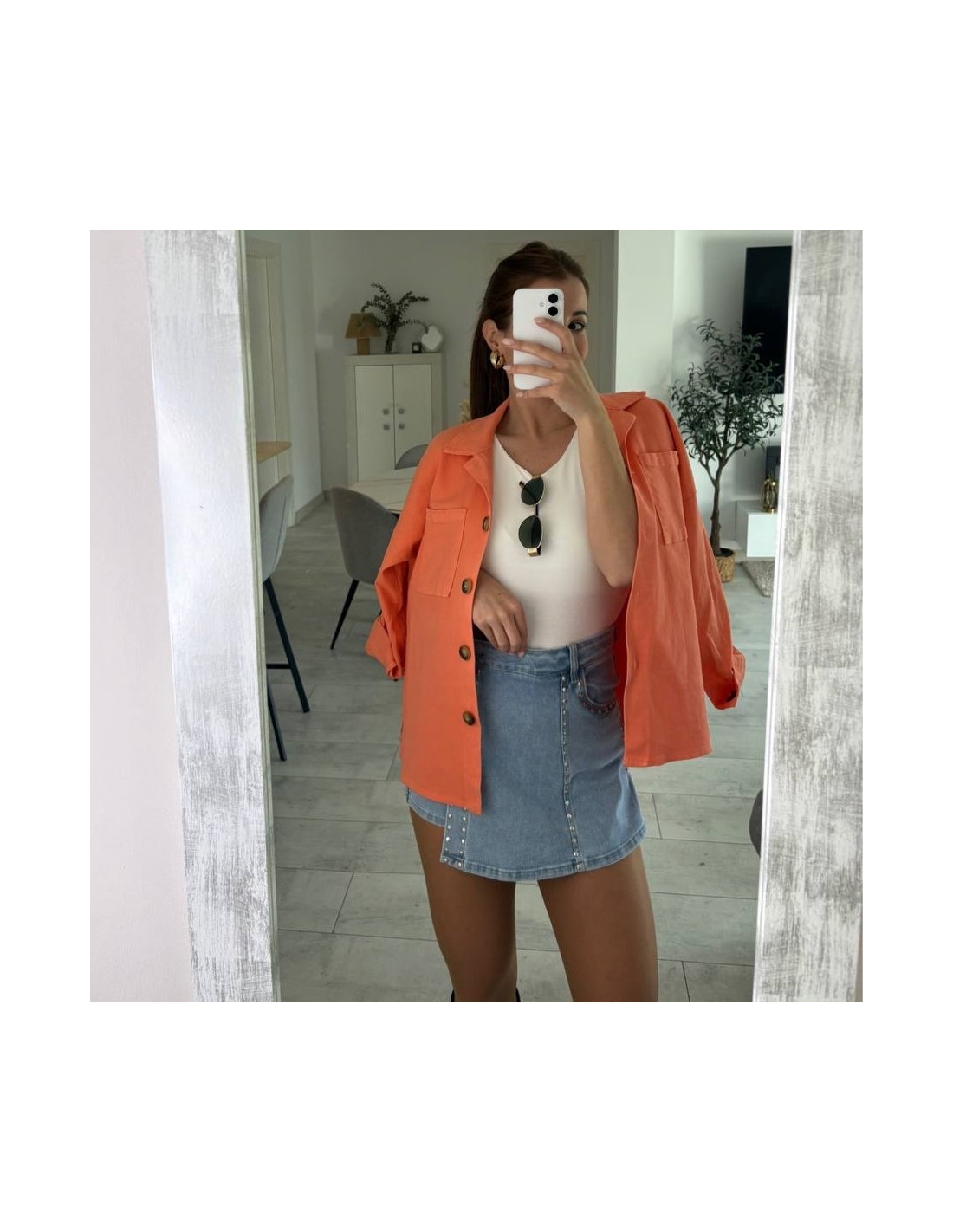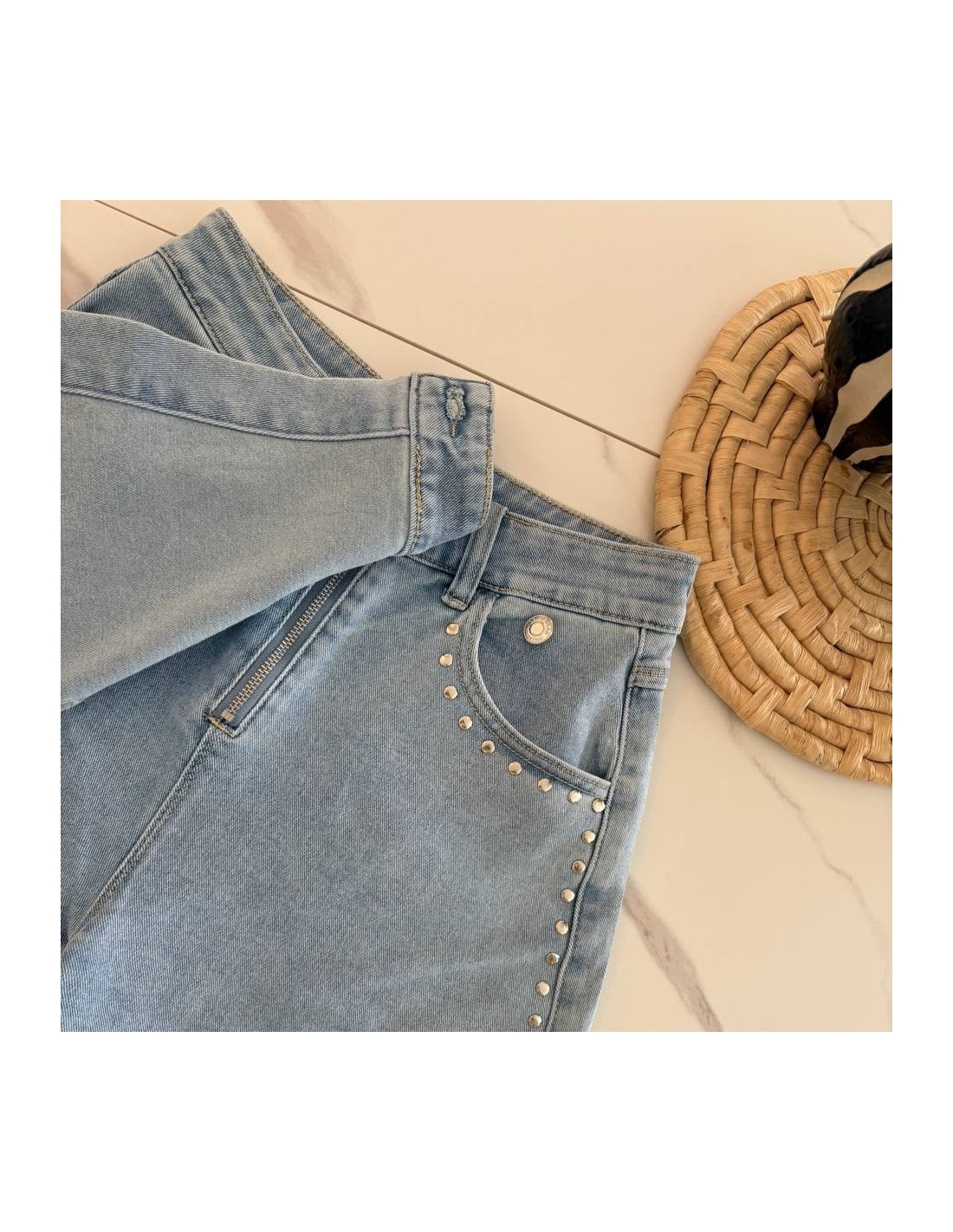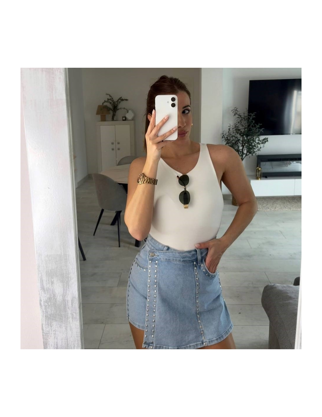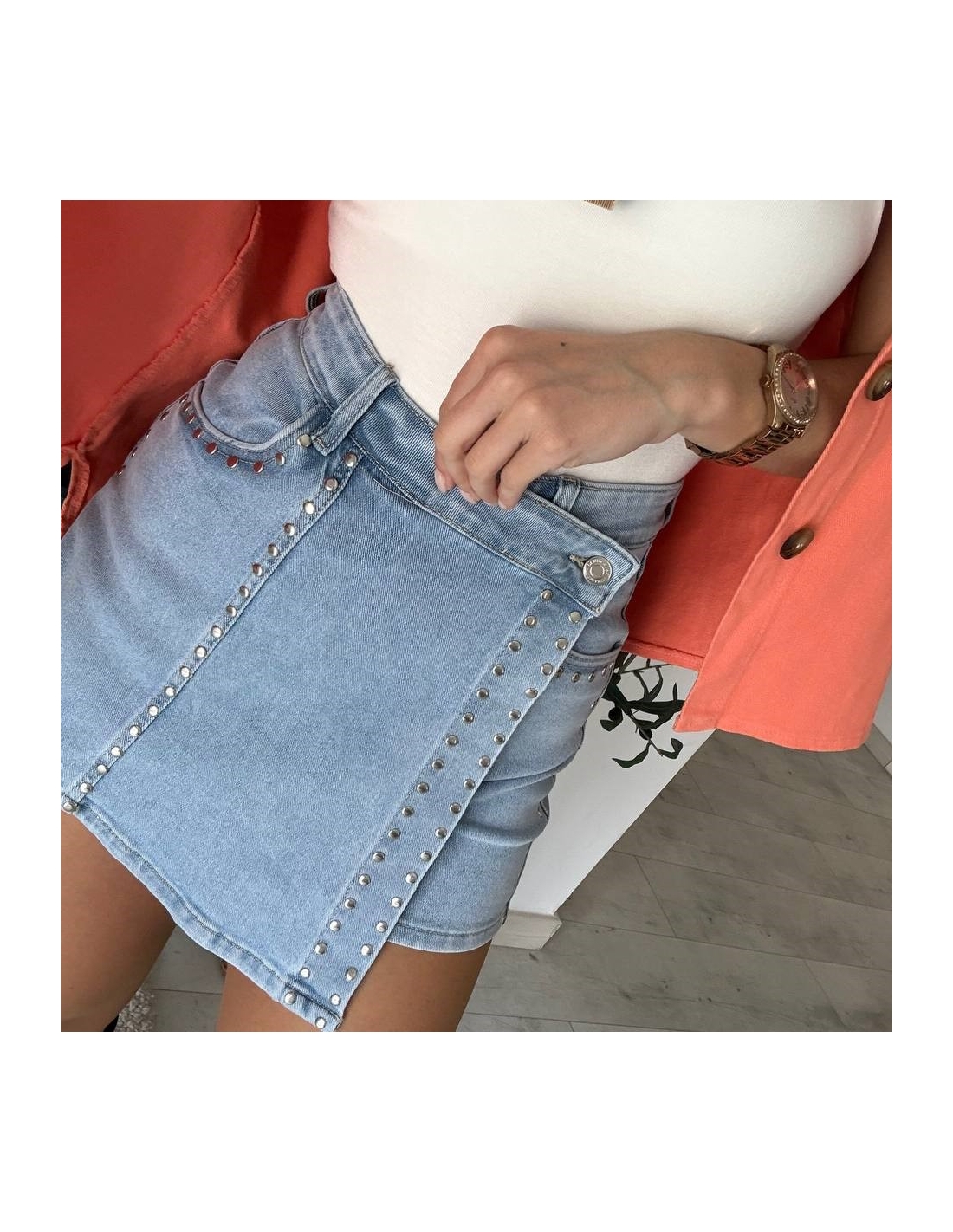 Falda pantalón vaquera con detalle tachas. Cierre con cremallera central delantera.