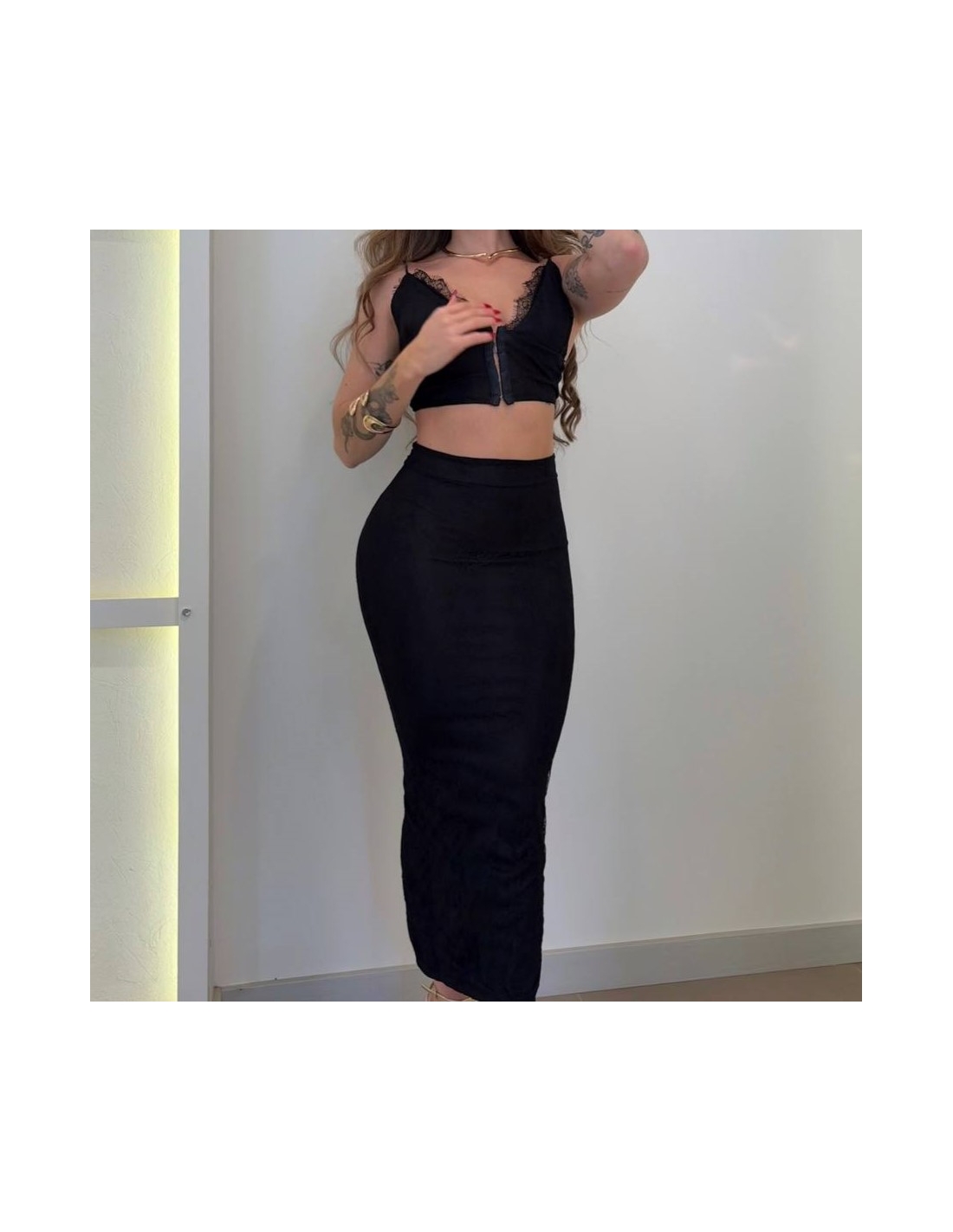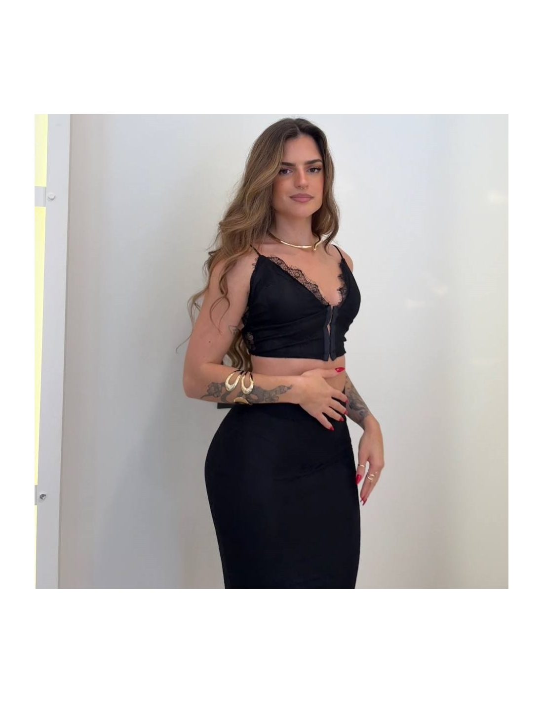Conjunto top + falda encaje. Top con cierre delantero mediante corchetes y tiranta fina regulable. Falda con cremallera trasera oculta. Talla única pequeña.