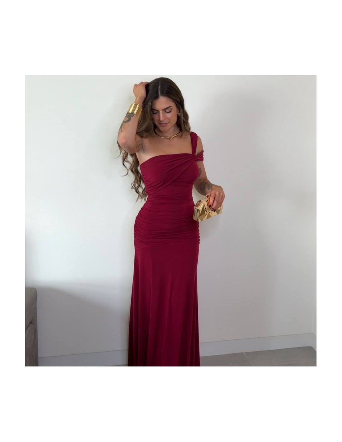 Vestido bella largo. Escote asimétrico. Fruncido en parte central. Fluido en bajo. Doble tejido. Talla única