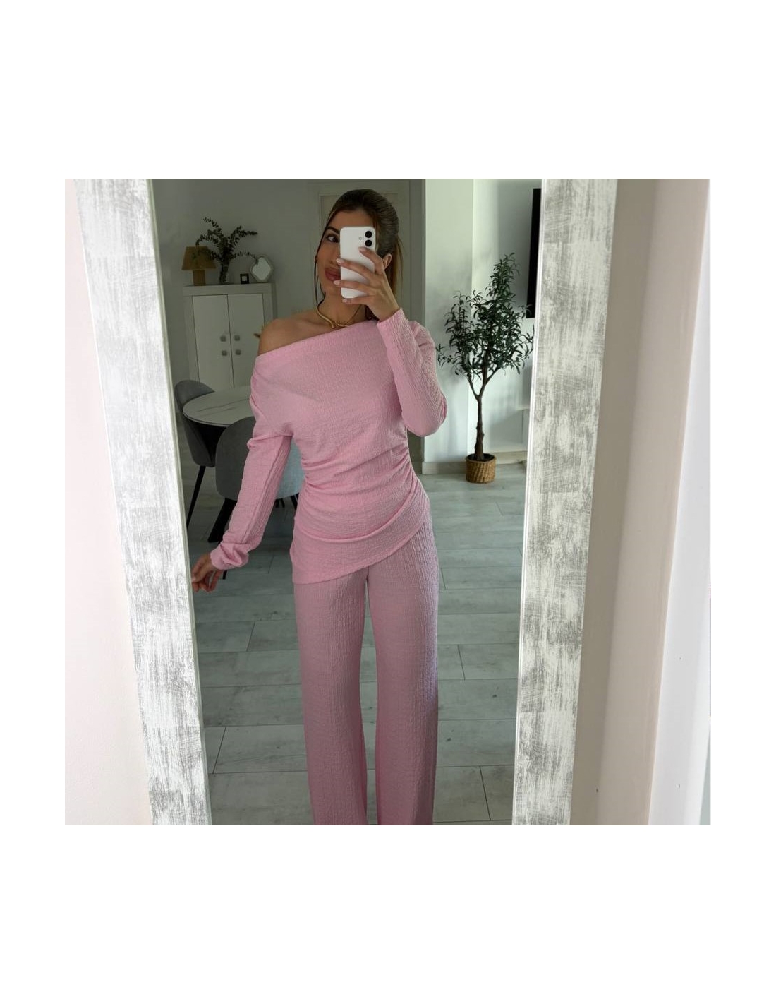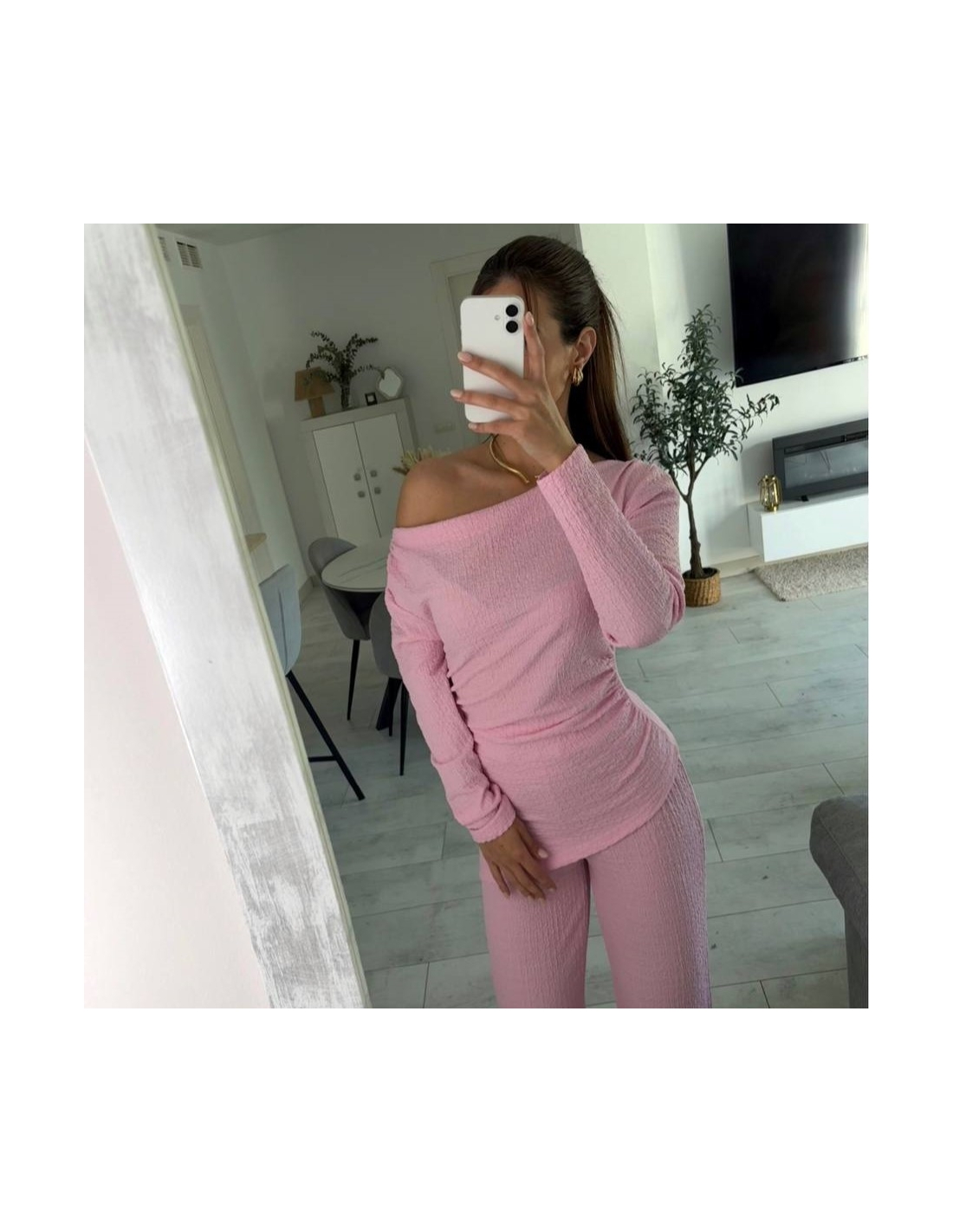 Conjunto de top más pantalón. Top con escote asimétrico, fruncido y manga larga. Pantalón de tiro alta con cintura elástica y campana. Talla única