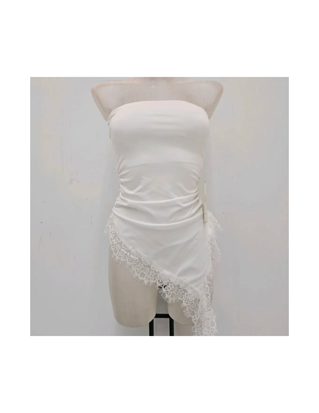 Top de palabra de honor con bajo de encaje asimétrico. Cascos incorporados. Tejido doble licra. Talla única.