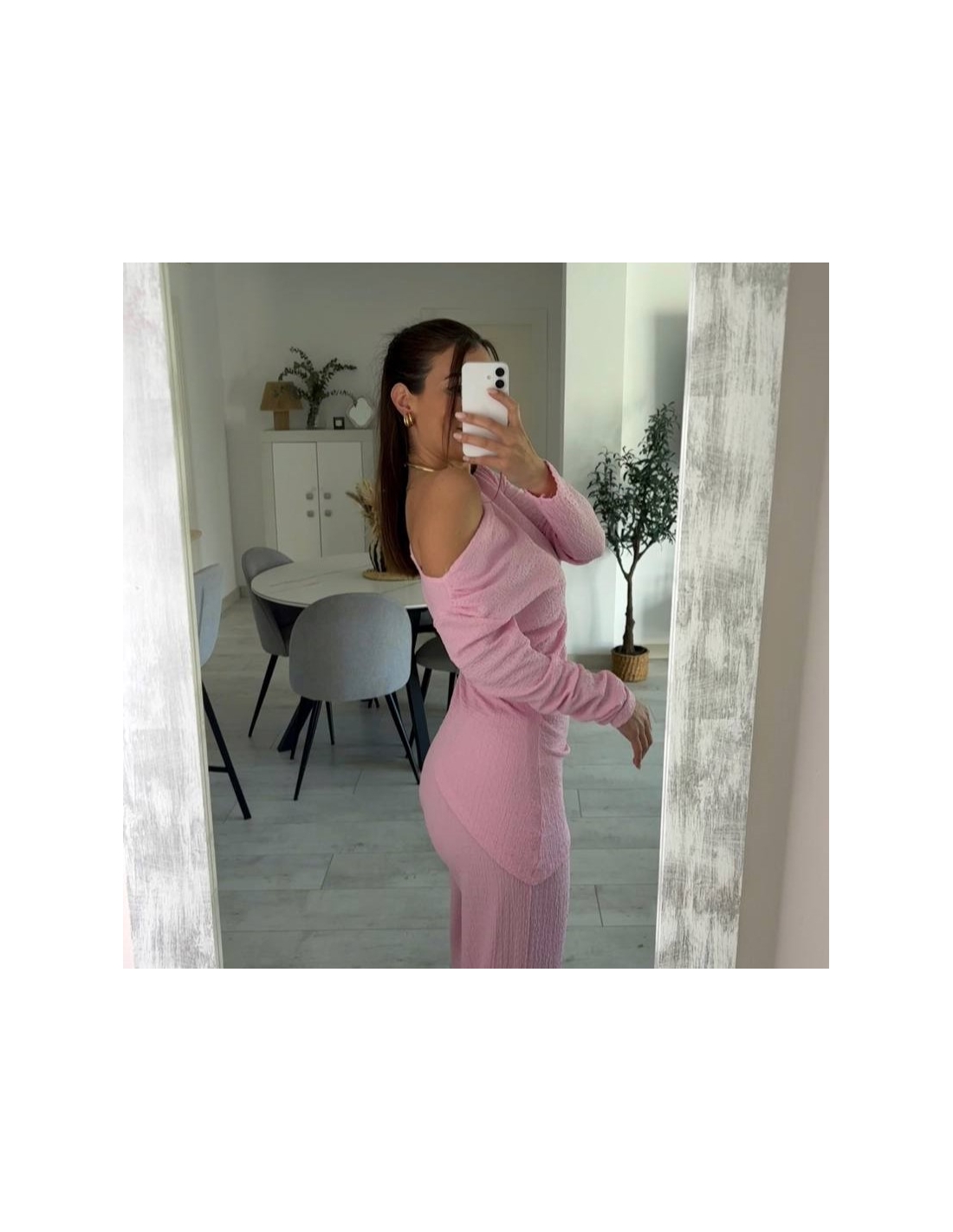 Conjunto de top más pantalón. Top con escote asimétrico, fruncido y manga larga. Pantalón de tiro alta con cintura elástica y campana. Talla única