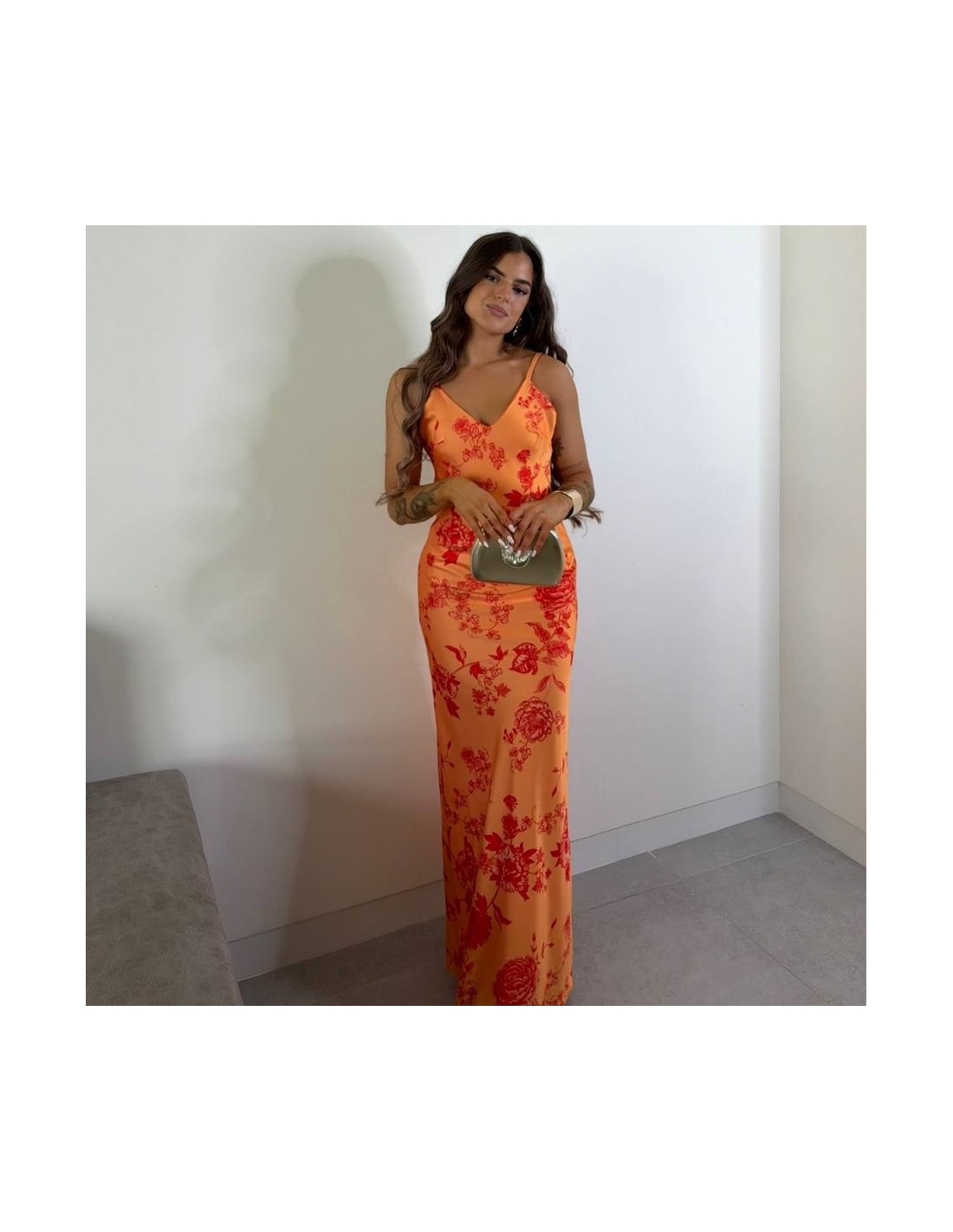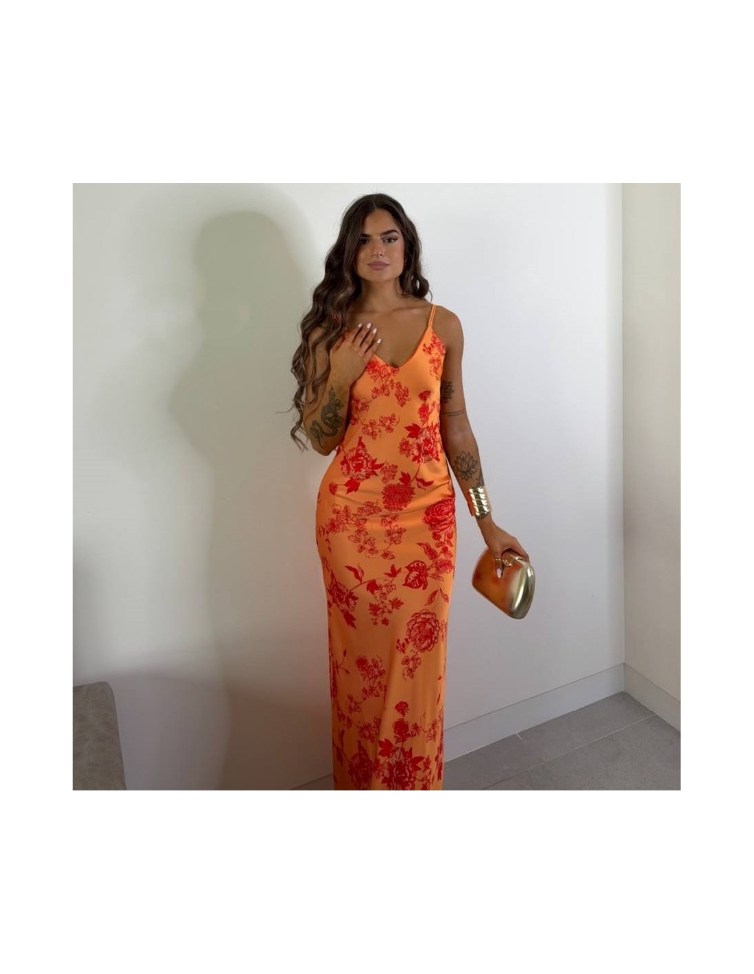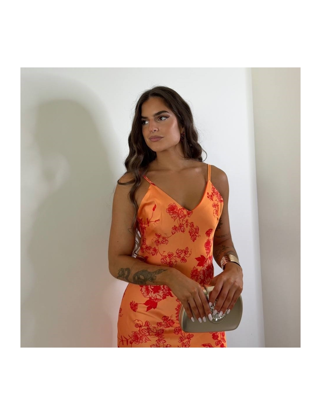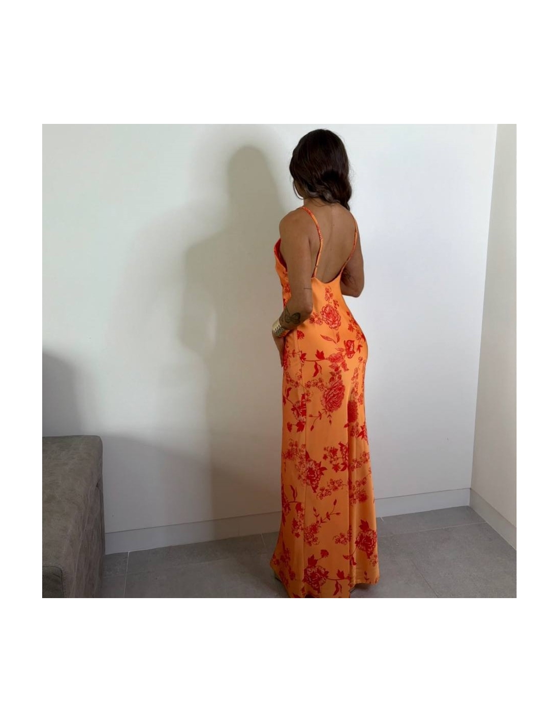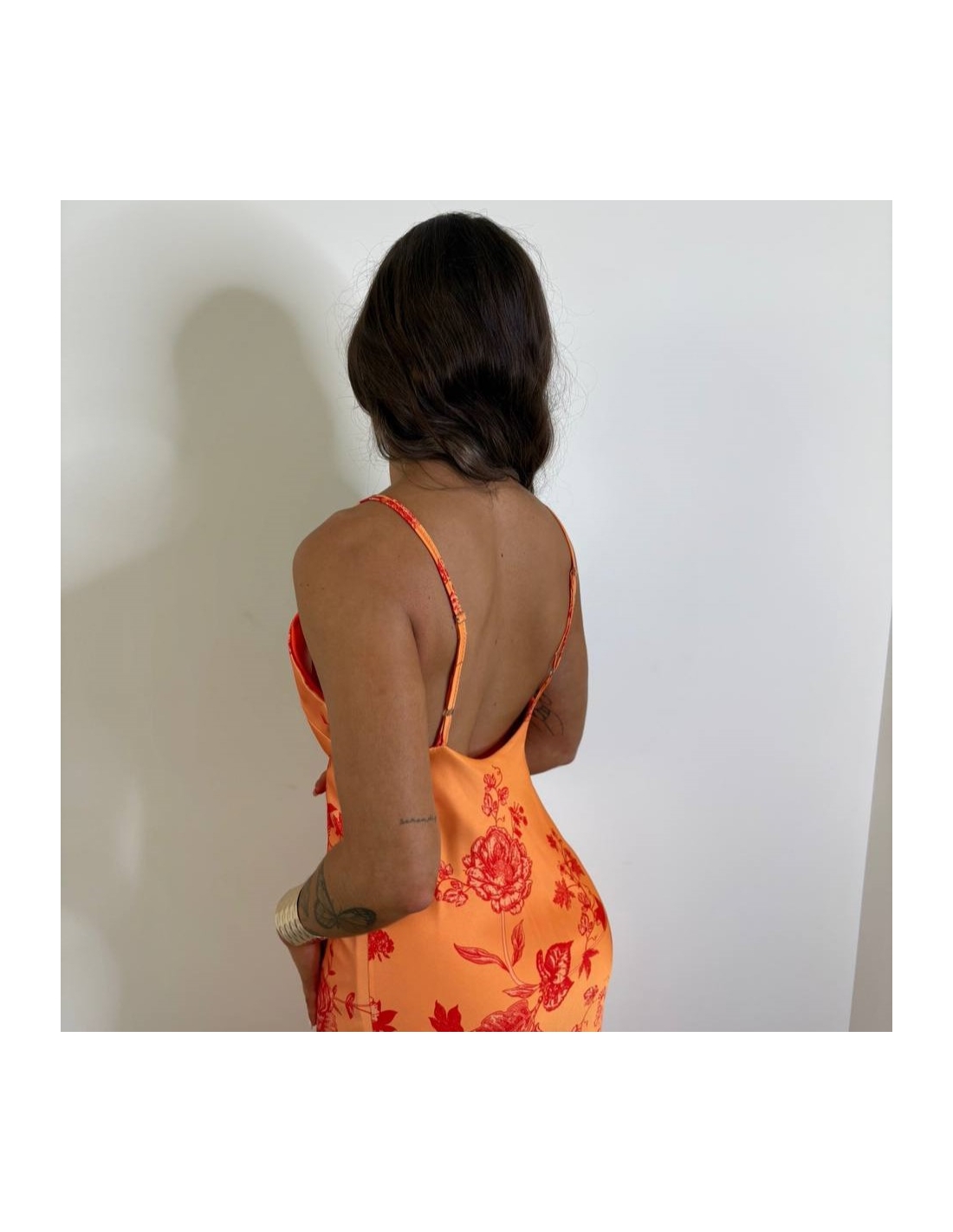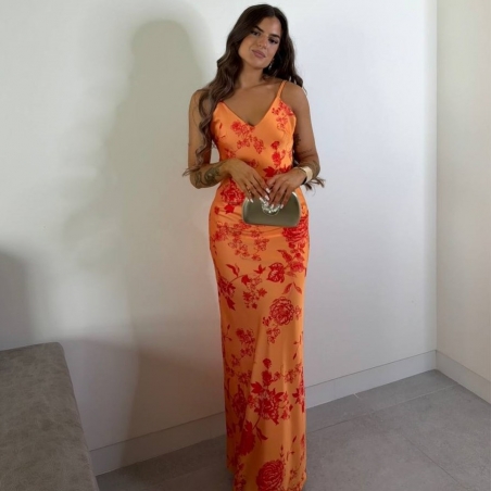 Vestido estampado en tonos naranjas. Tiranta regulable. Escote en pico. Tejido satinado. Talla única.